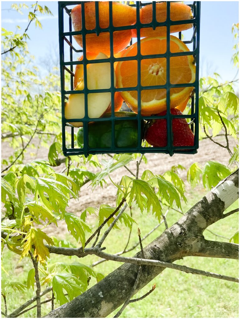 During COVID, when we all had extra time, I was inspired to not just toss, but cut up our oranges into round slices. I used the orange slices to fill up a typical suet feeder. The birds, loved it!!! Specifically, the Orioles loved it!