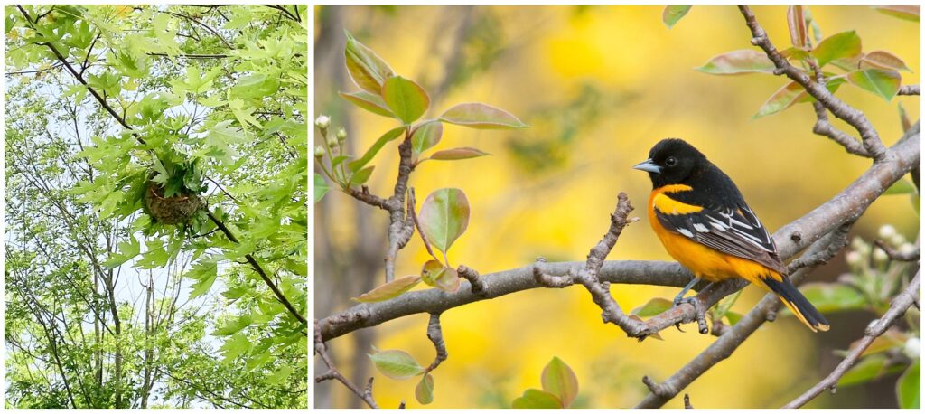 In addition to hanging the fruit-filled suet feeders in our main bird feeder area (not pictured), I also hung them in places where we weren’t able to see them. These feeders helped draw the oriels to our property. I hung them on the woods side of our property, knowing the oriels spend a lot of time in the woods. I placed them in trees with good coverage from foliage and blooms that provide a big of safety and security.