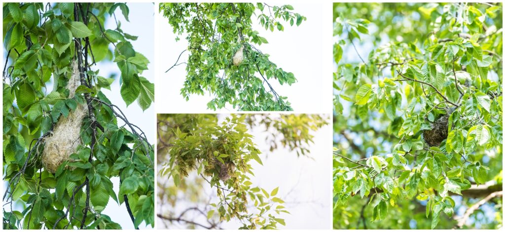 On the left is an actual nest from our property! Oriels build their nests high up towards the top of trees, making them tricky to spot. Below are more examples of the bag like nests oriels build.