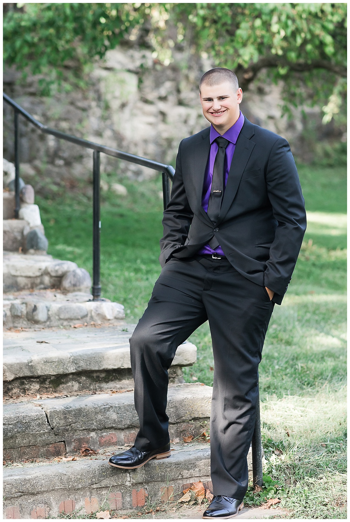Meet Jared! He incorporated his passions into his senior band session in Huntington Indiana. Of course, one of his passions is music! He’s very active in his high school’s band program. Jared has taken part in a concert band, marching band, pep band and winter drum line during his high school career! Being a part of so many groups he consistently plays both the trombone and the baritone. The baritone is use on the field during marching band when maneuverability and spacing are important. The trombone is played during concert and pep band. Of course, I asked him to play the trombone for me during these pictures! 🙂 It’s fascinating and amazing to me that the notes are the trombone are determined not by keys, but by how far the slide is extended. I enjoyed the diversity of the dressed up formal band shots of Jared in his suit, and then his letter jacket representing marching band.