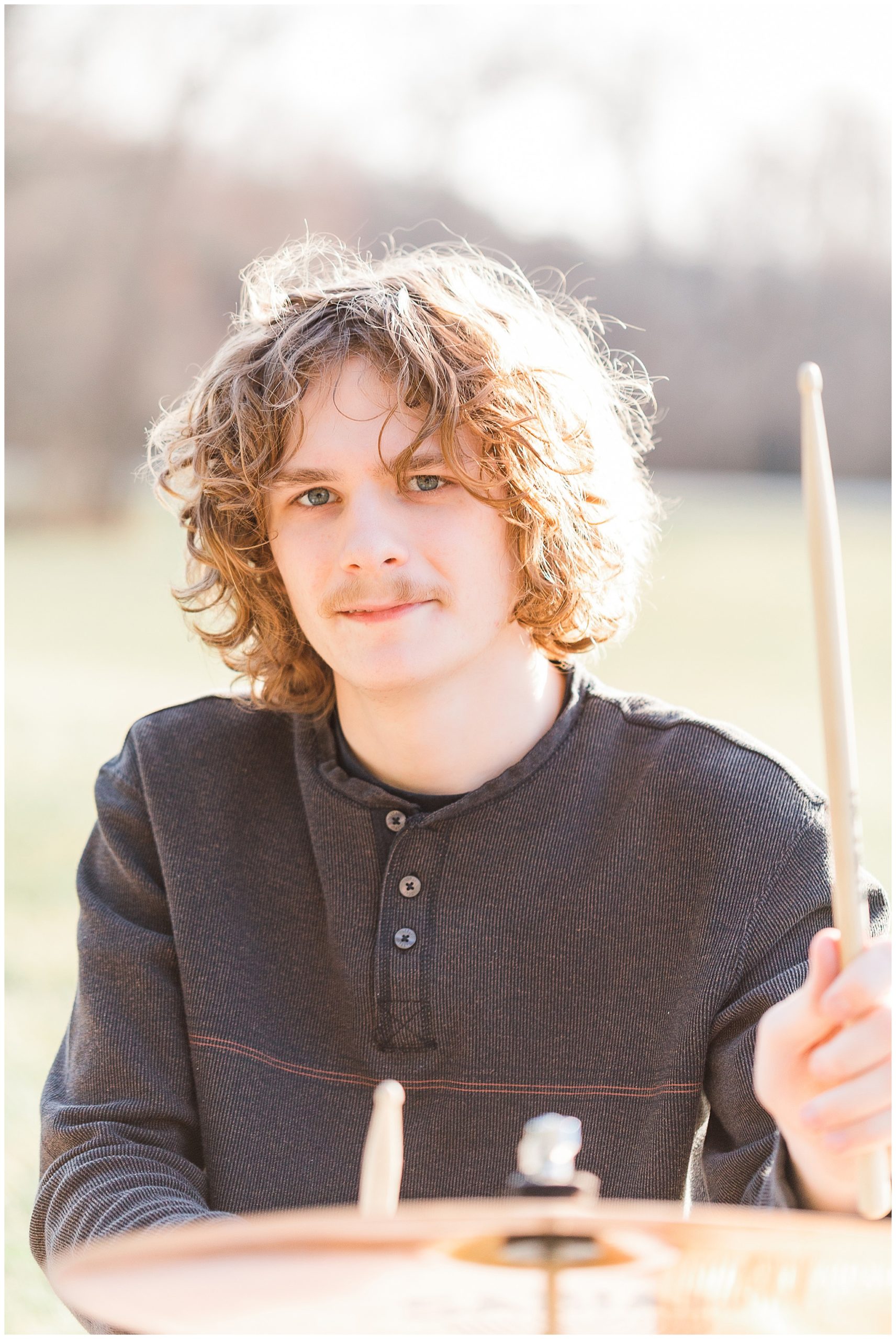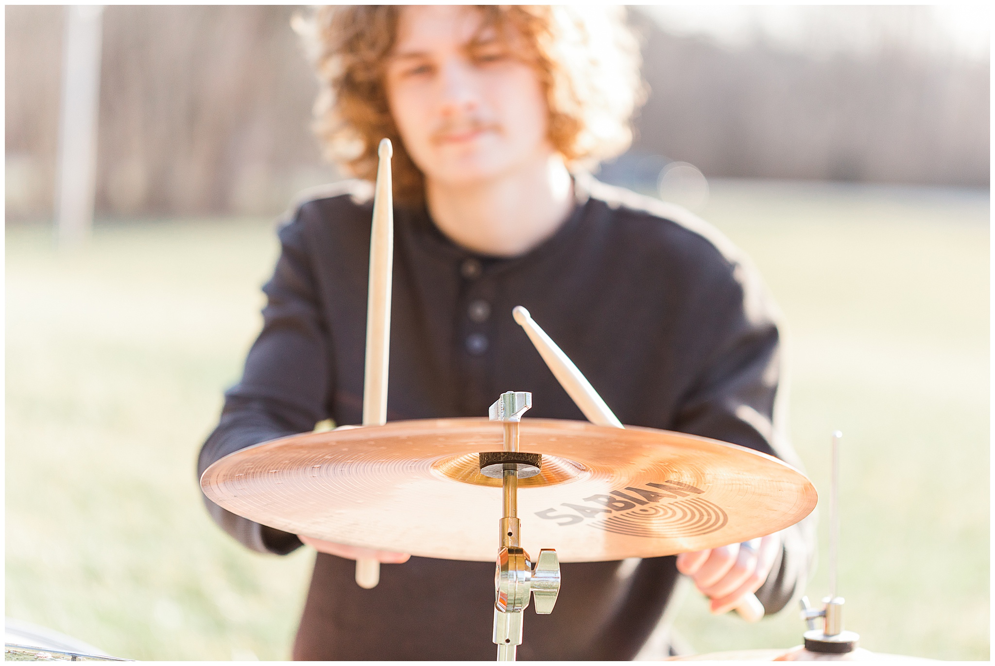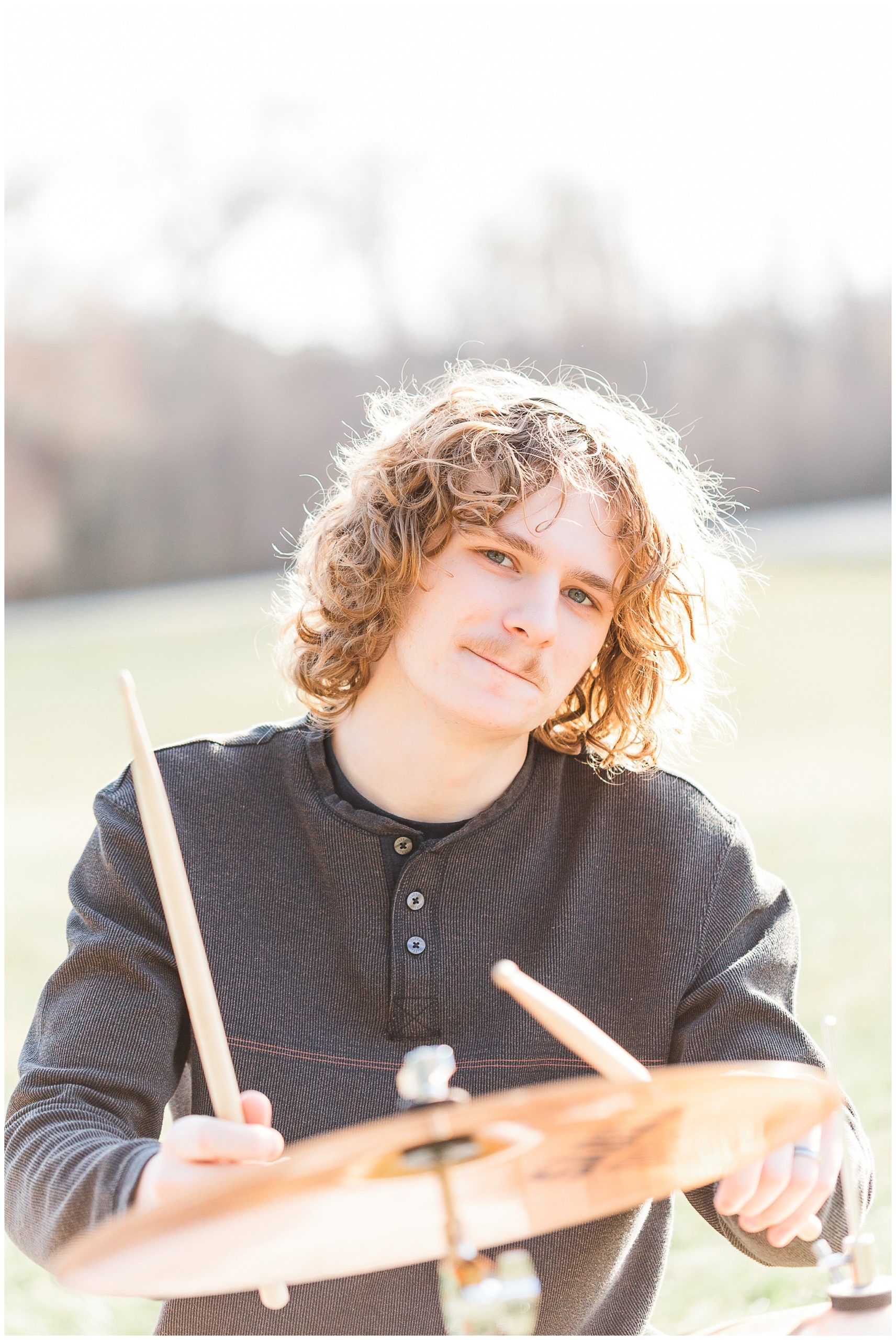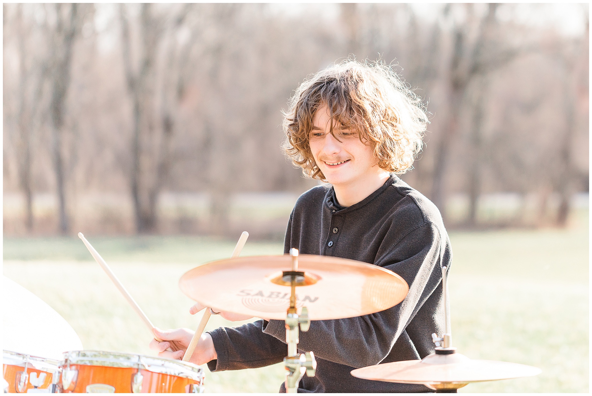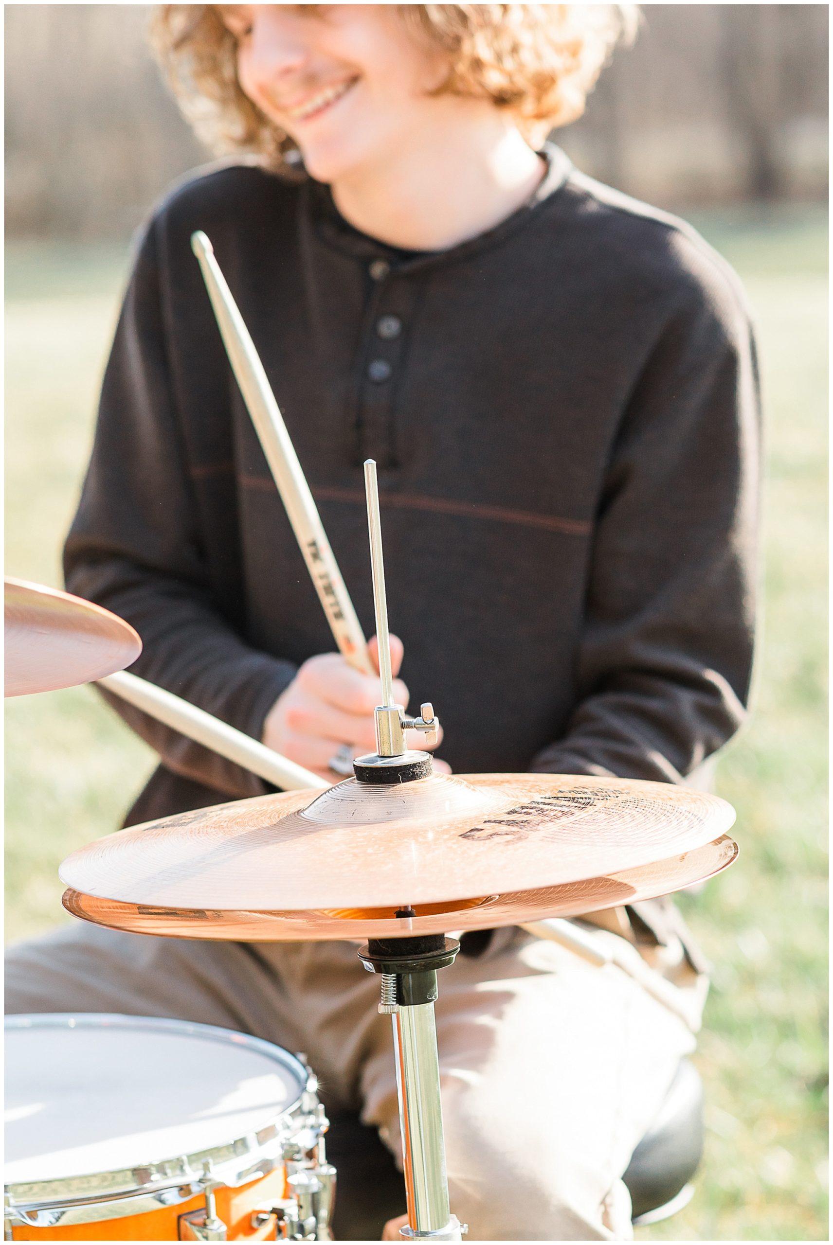 I’m so excited to share this drummer senior session with you!  Remember just last week when I was warm and sunny?  Carson was so fortunate that his senior session was scheduled for that day!  By far the nicest weather day of spring break!  Carson has been playing the drums since middle school.  So of course drums were by far the most important element for him to incorporate into his senior session.
