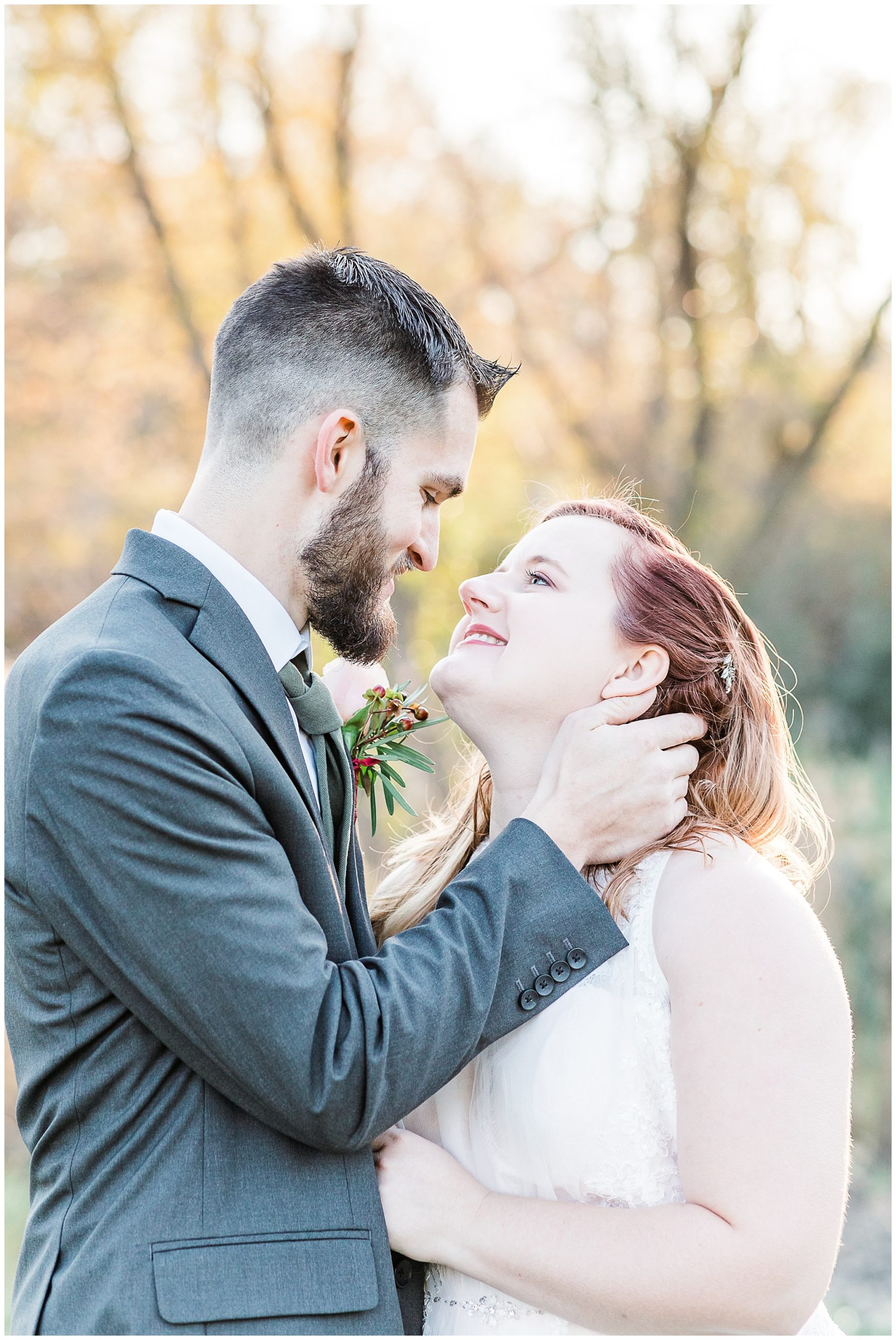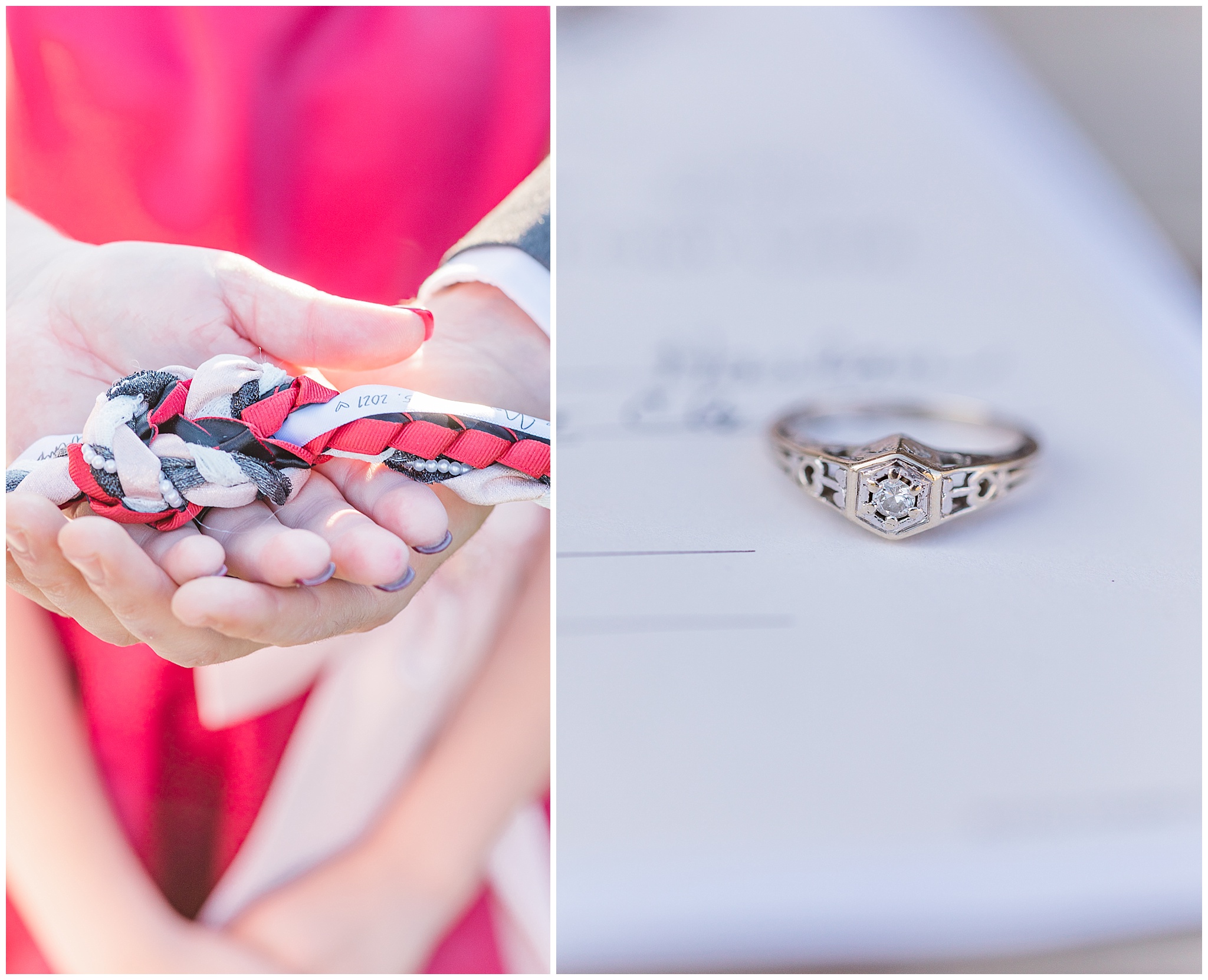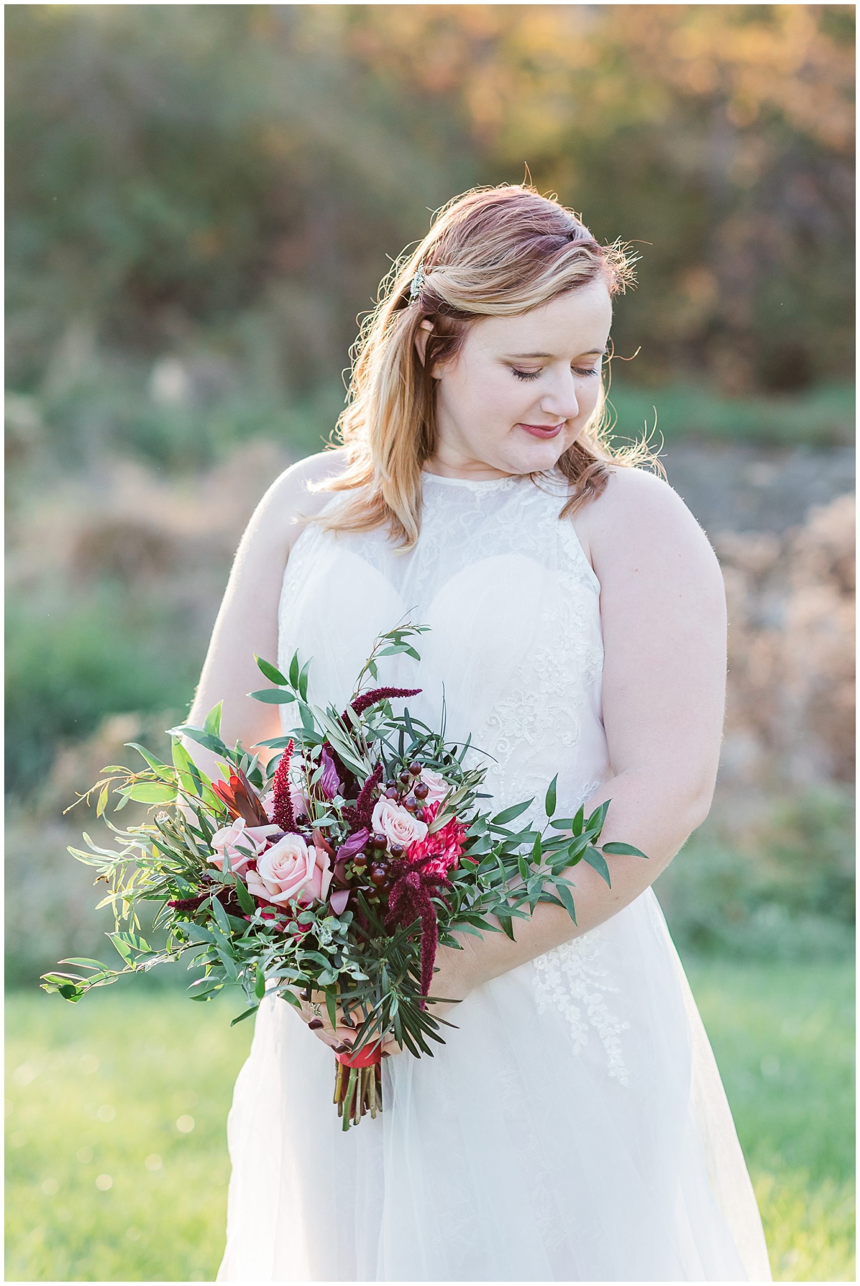 An avid sewer, Stephanie bought her wedding dress, then altered it to give it a more personalized look. The dress was beautiful with a lace underlay over pink satin. Her daughter C, helped Stephanie with the finishing touches, tying up the back of her dress. before heading to the ceremony site for a first look. While making alternations, Kyle had seen Stephanie in her dress. However, he hadn’t seen her all wedding day ready in her dress! After a brief first look Stephanie and Kyle exchanged personal handwritten vows with each other.