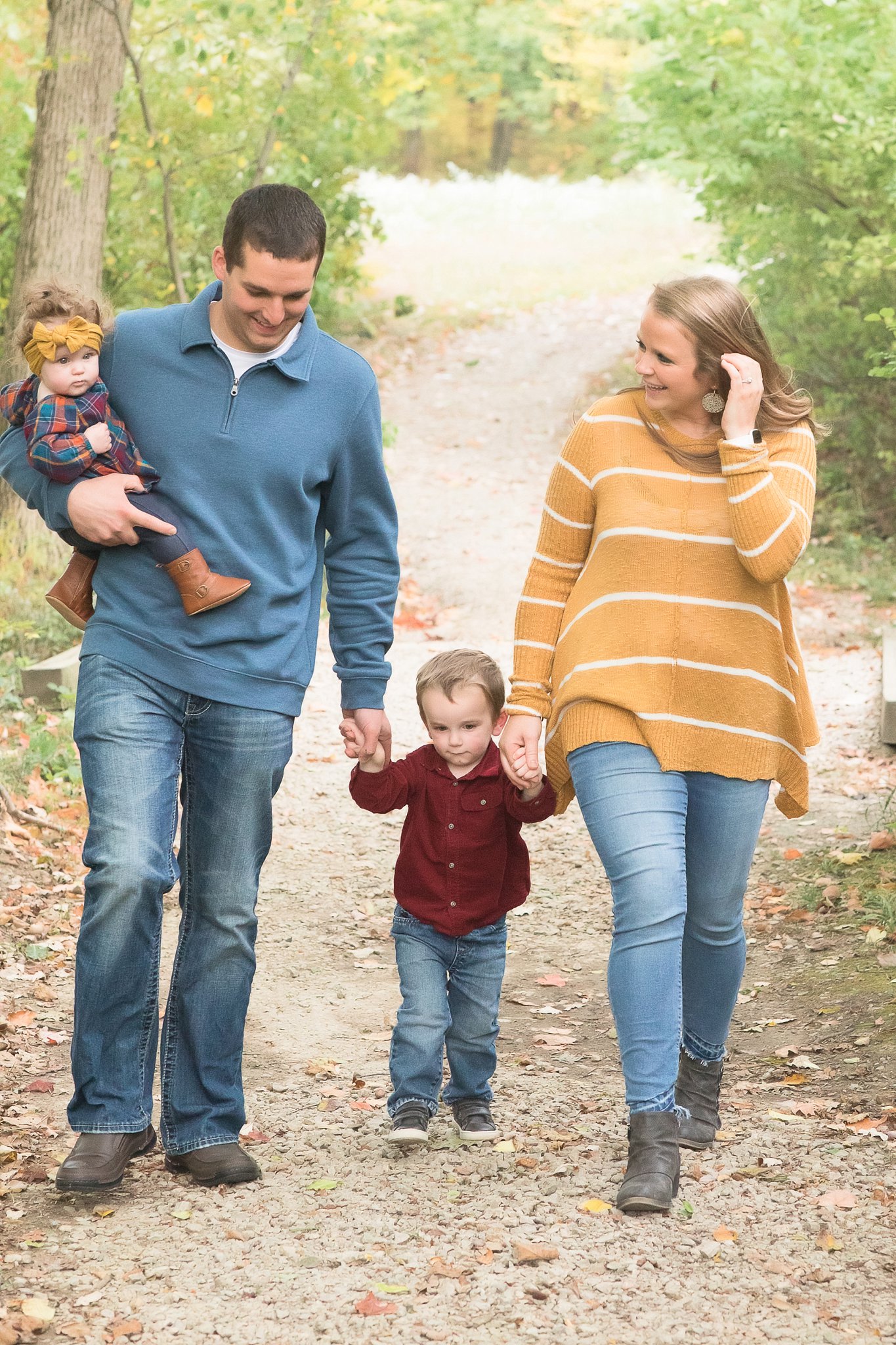 Hannah’s husband has a job that keeps him always on call, so we scheduled them for a daytime session when I could be most flexible. Session day arrived, and you guessed it, her husband got called in to work. *Sigh* Hannah and I kept in contact and she let me know when she knew he would be able to make it to their planned session time. Hannah is an amazing lady! She beautifully matched their outfits, and planned family pictures with two children two and under along with the family dog! Wow! What a woman! 🙂 Hannah and her husband Nathaniel are blessed with family nearby, and grandma came to the shoot with help with the kids and the dog.