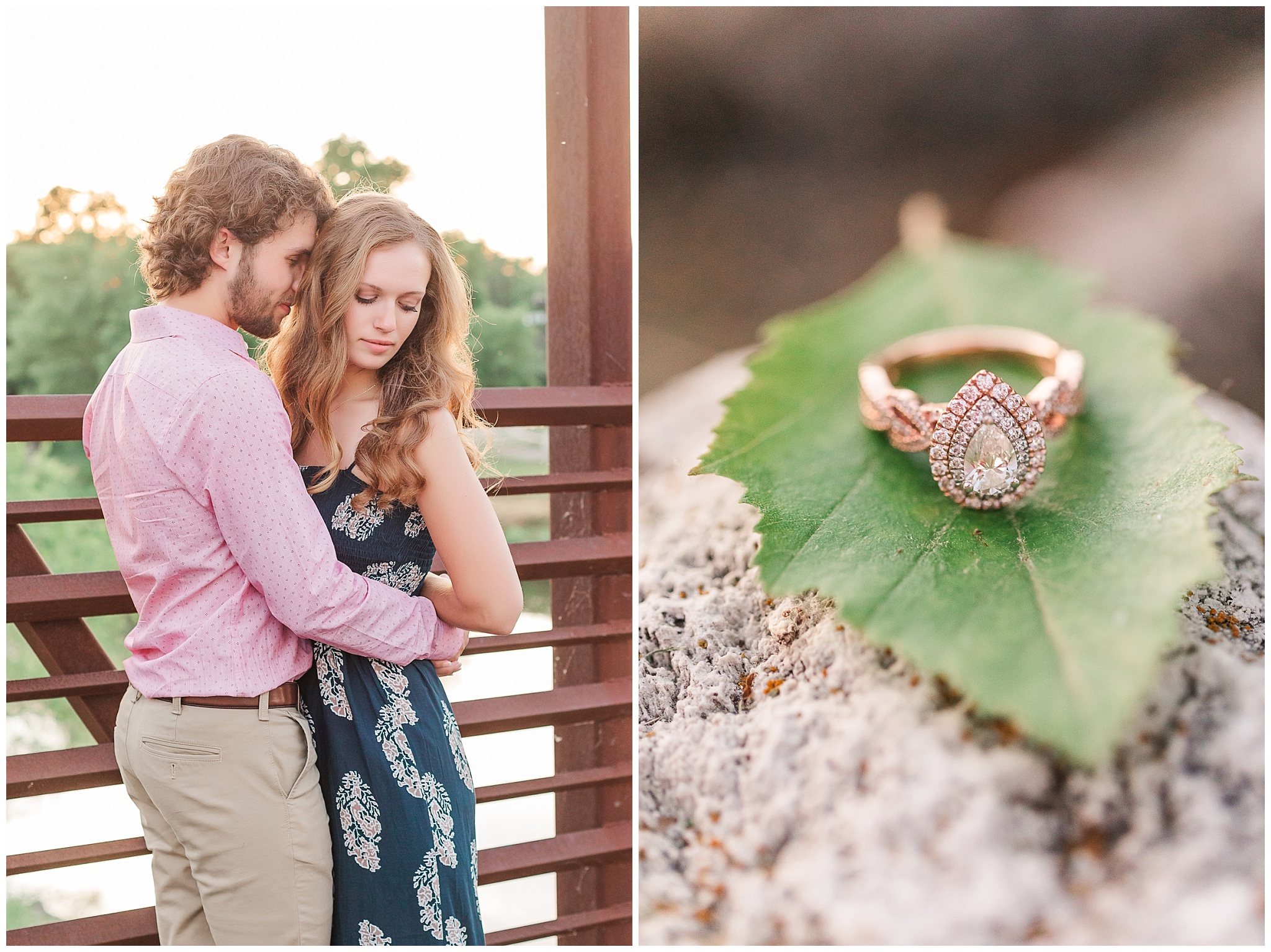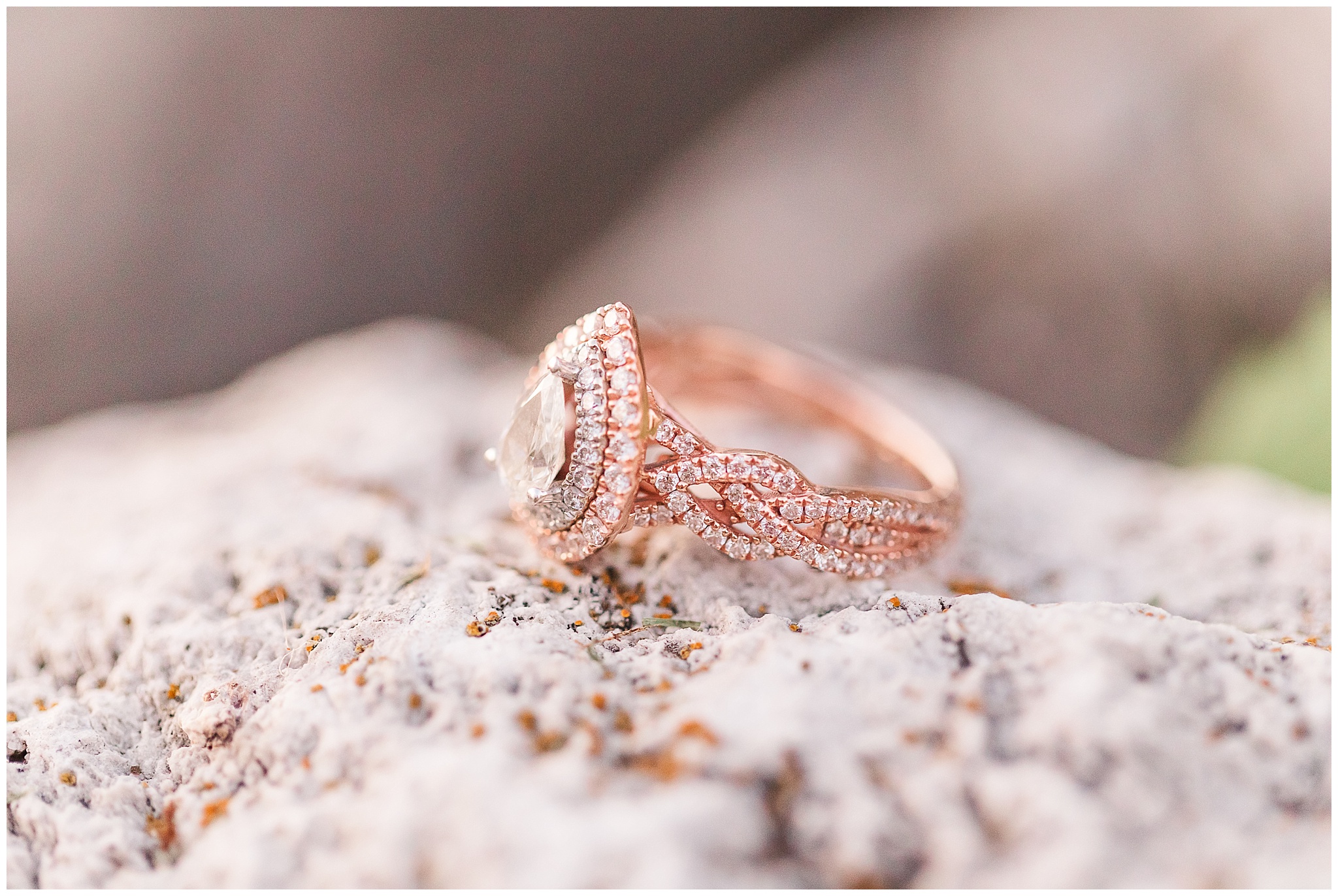 Cierra and Tyler were high school sweethearts. They have grown and deepened their relationship over the years. They broke up and were led back together through a lot of prayer! Once they reconnected, they quickly knew they were meant to stay together. They looked at engagement rings together online and planned to do more looking in person. Tyler had other plans. He took the ideas they had seen and chose a beautiful pear-shaped diamond setting with a unique rose gold band! He planned a sweet surprise proposal and both of their families were waiting to celebrate with them.