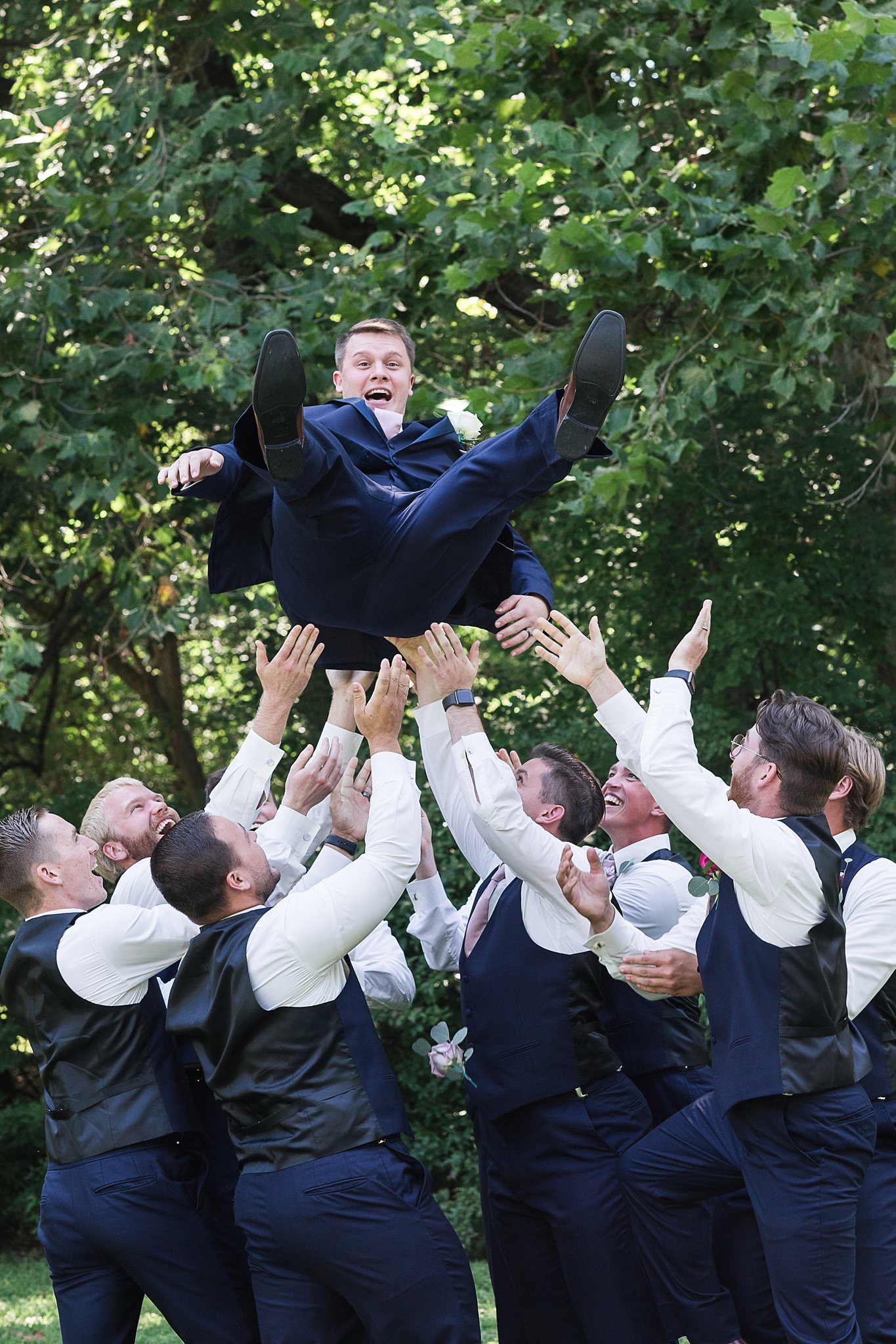 The guys all looked so dapper in their navy. My favorite picture is when they lifted Drew! Much to my surprise they then tossed him in the AIR!!!! It was rough on the boutonnieres, but what a great picture!!! Drew also said it was AWESOME!