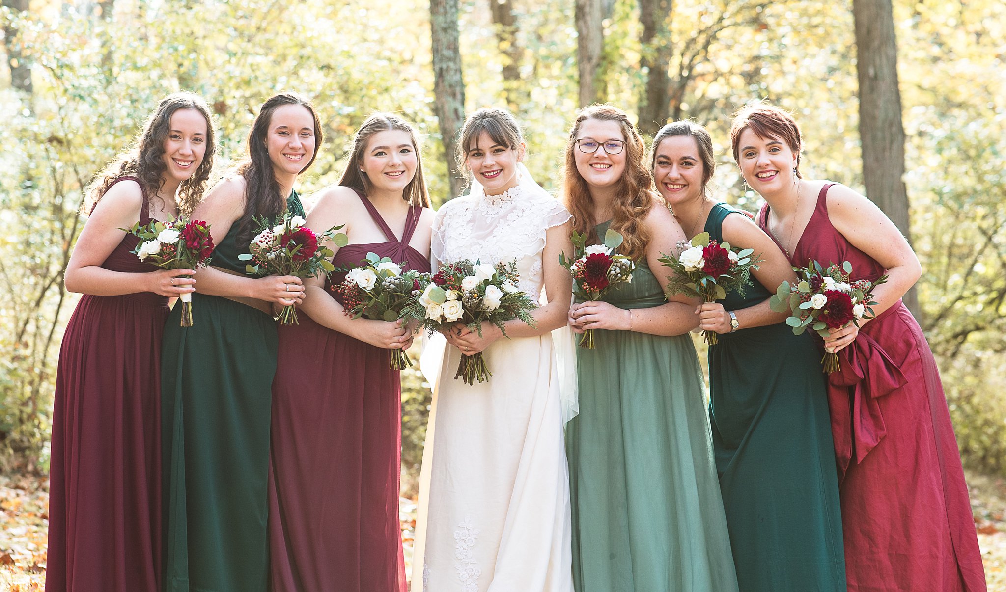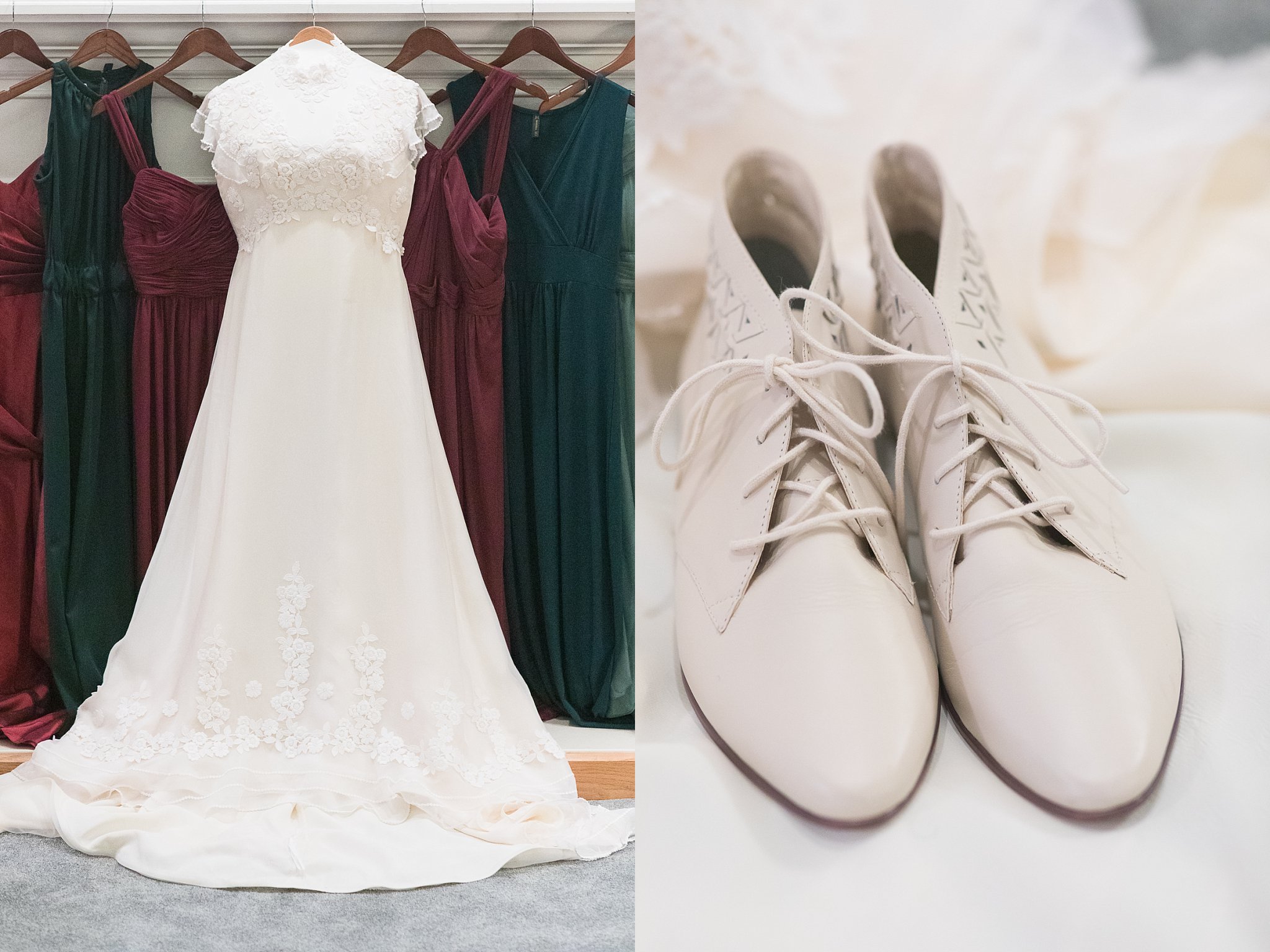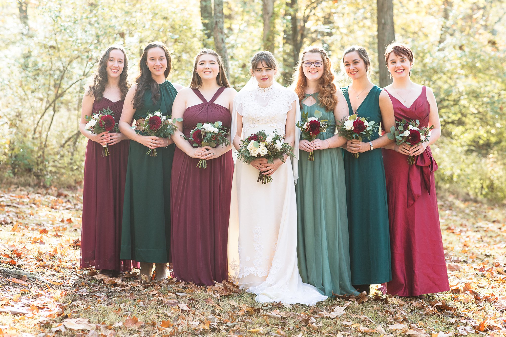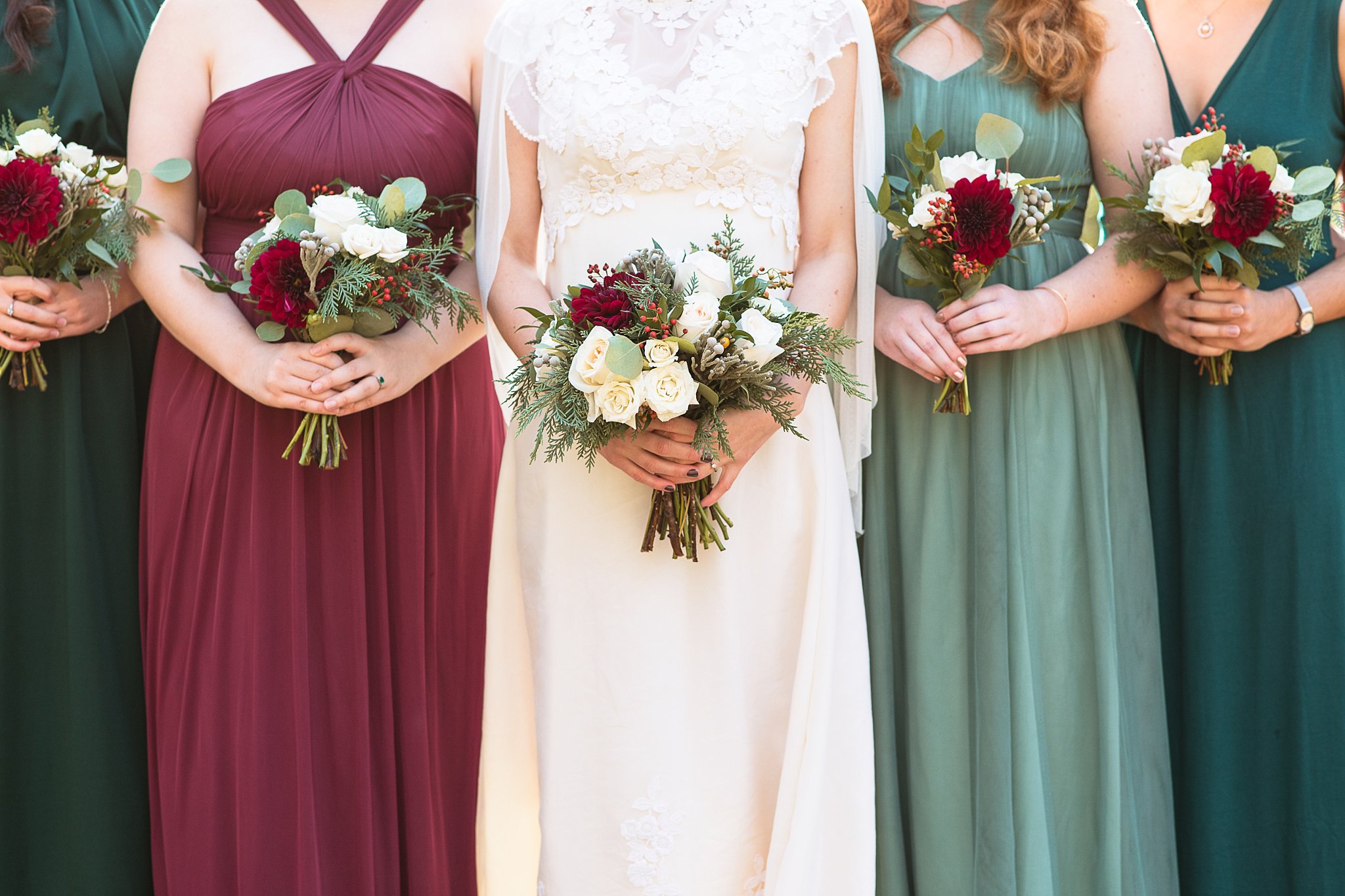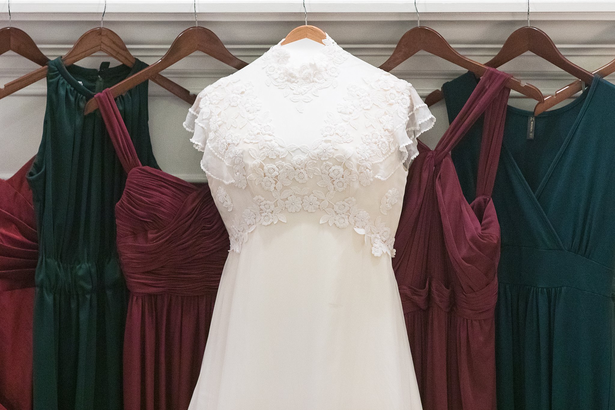 The day started so early, that it was still dark outside! I was thankful to be able to use the fireplace mantel to hang the dresses on. Aimee chose a unique and lovely vintage dress from Esty that was perfect for her! She was a gorgeous bride! For bridesmaids dresses, Aimee choose a beautiful array of burgundy and greens for that looked stunning together!
