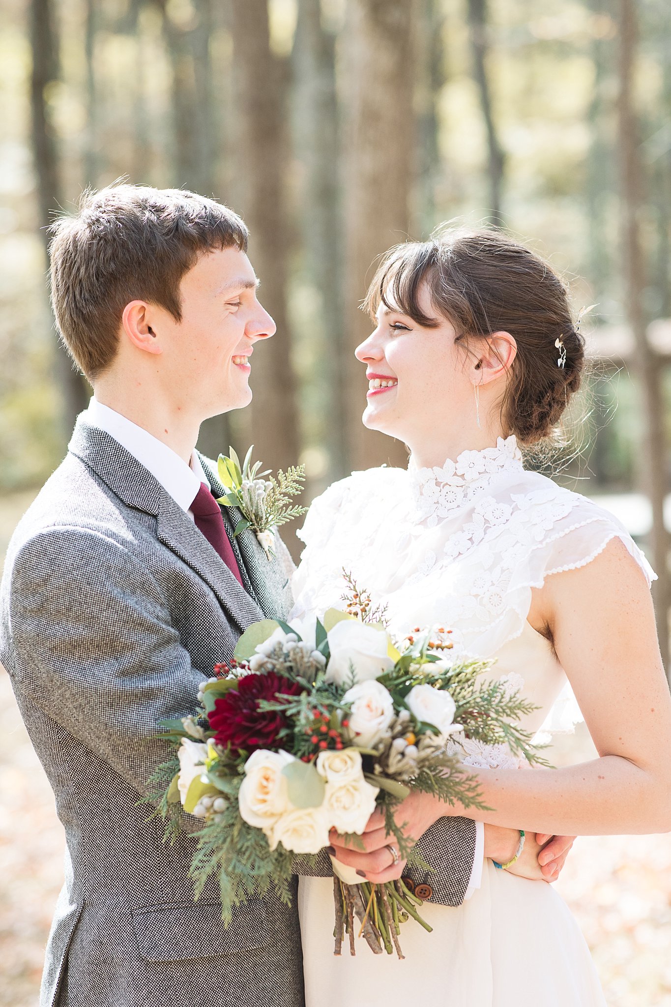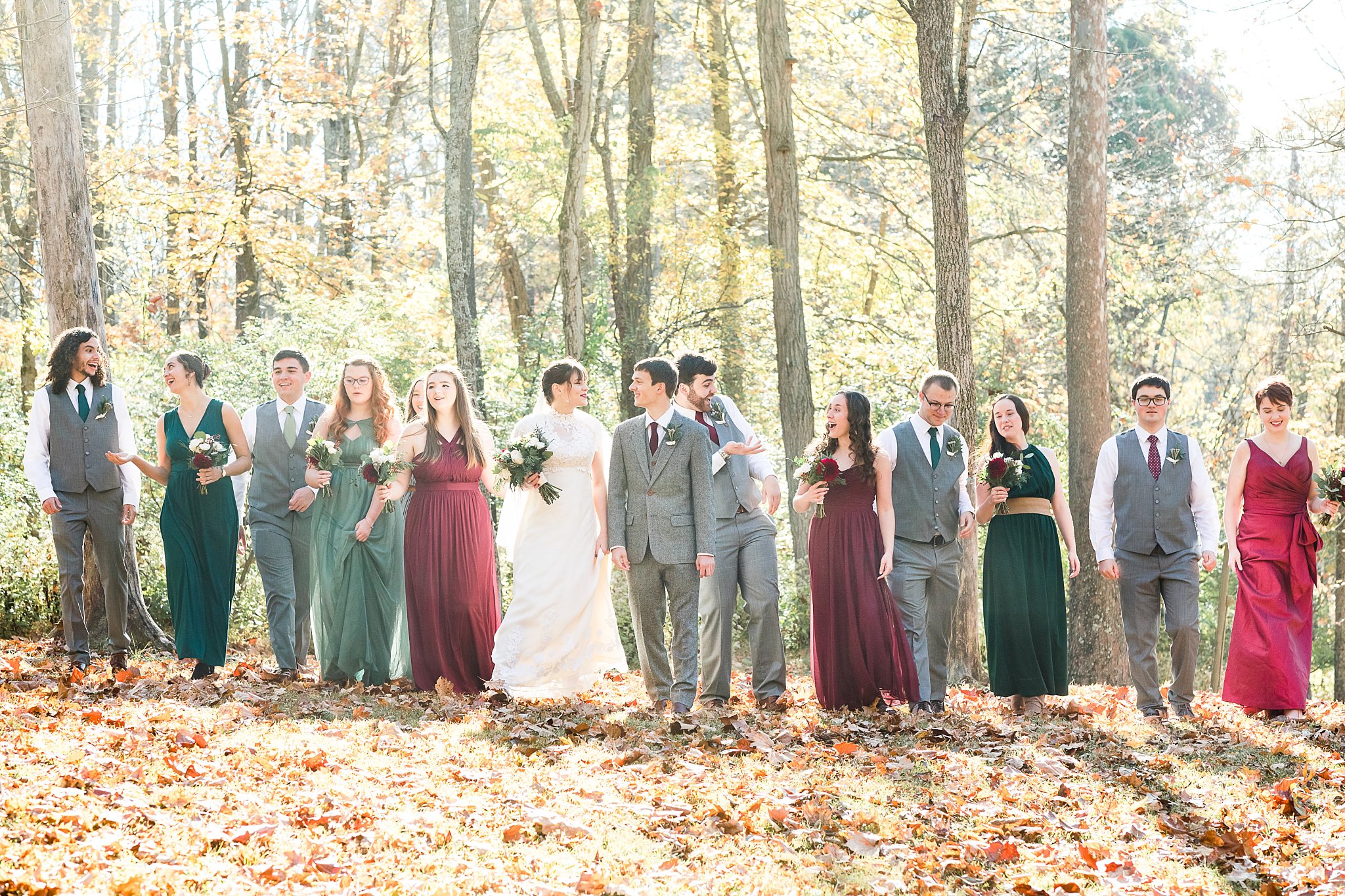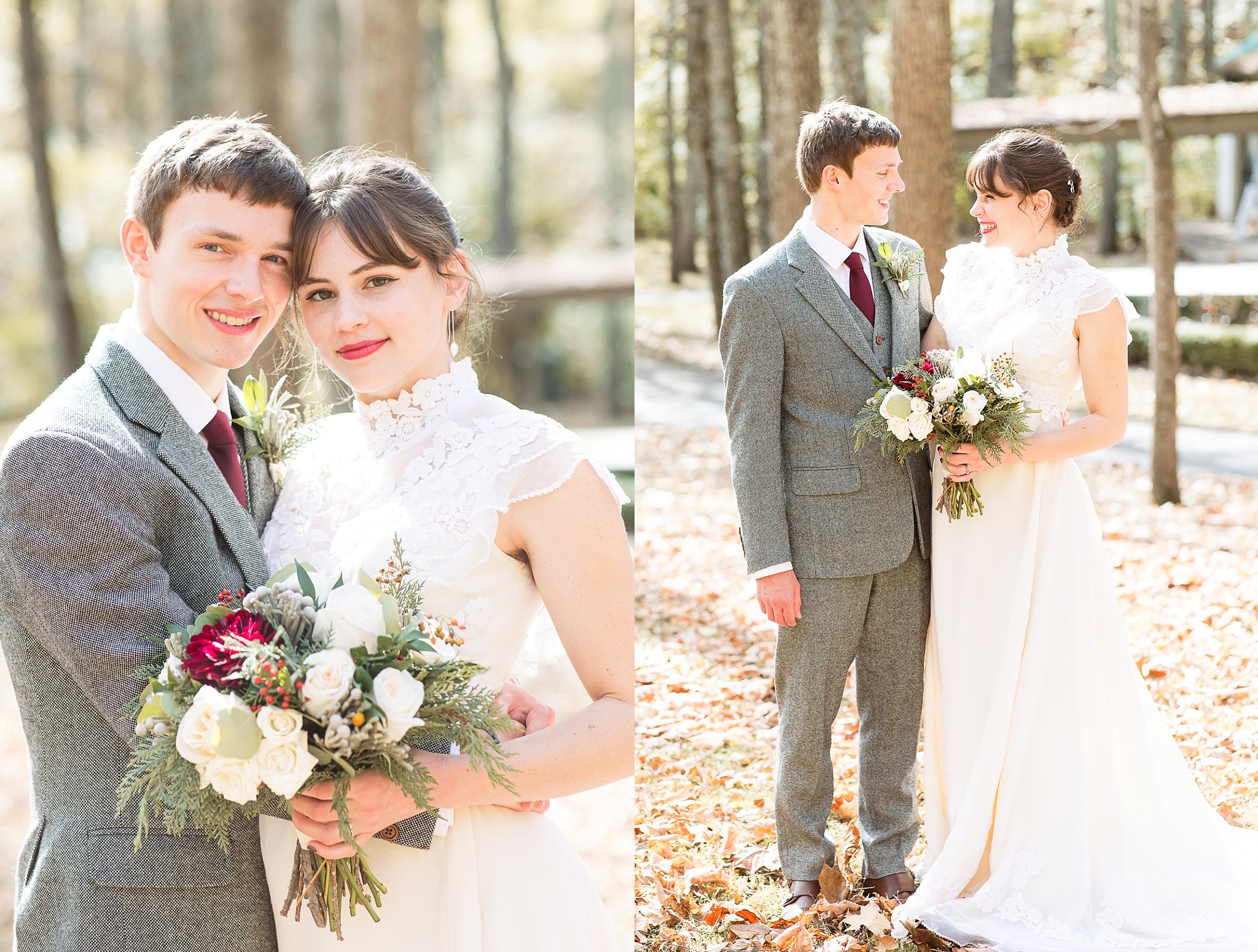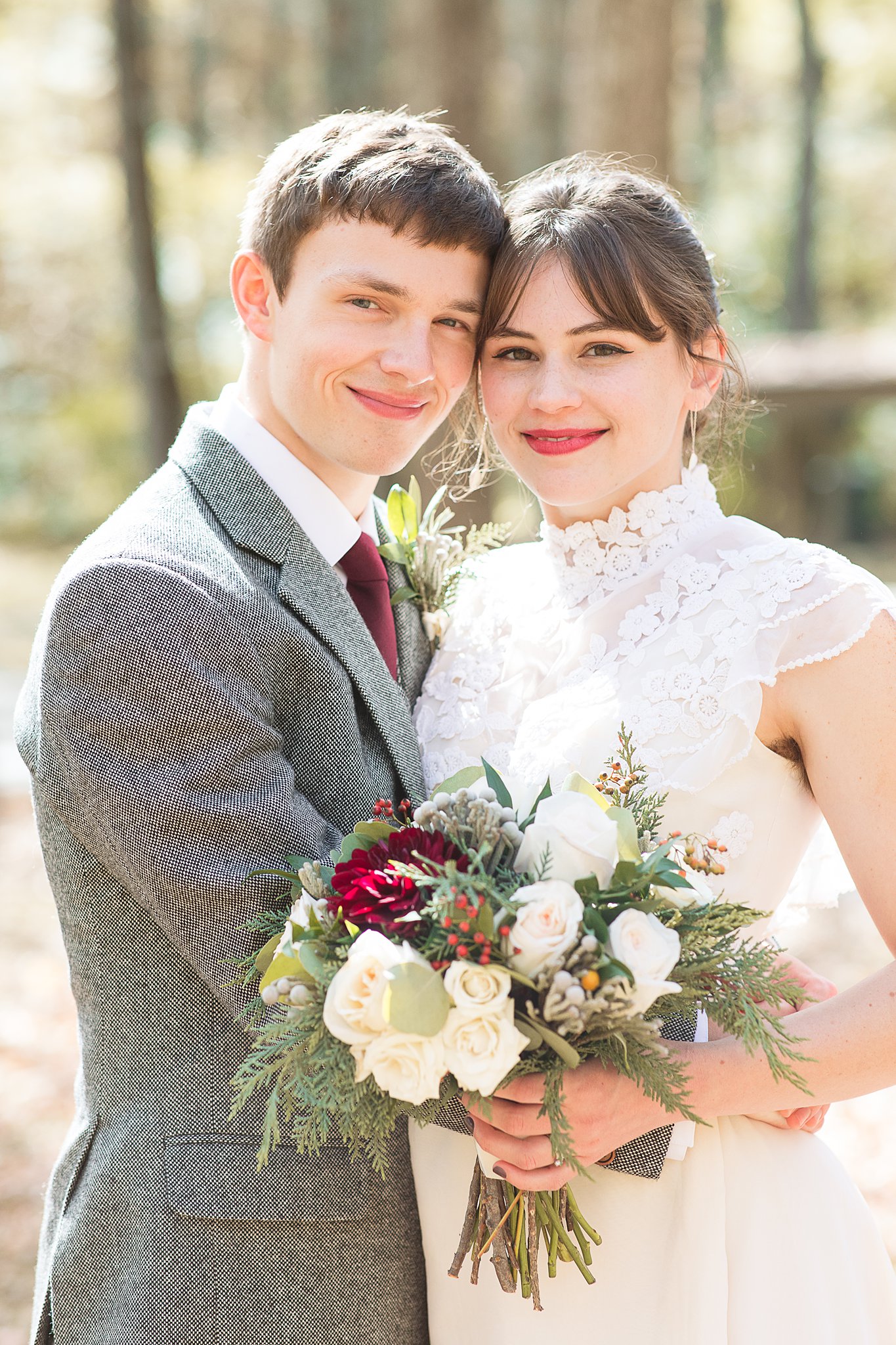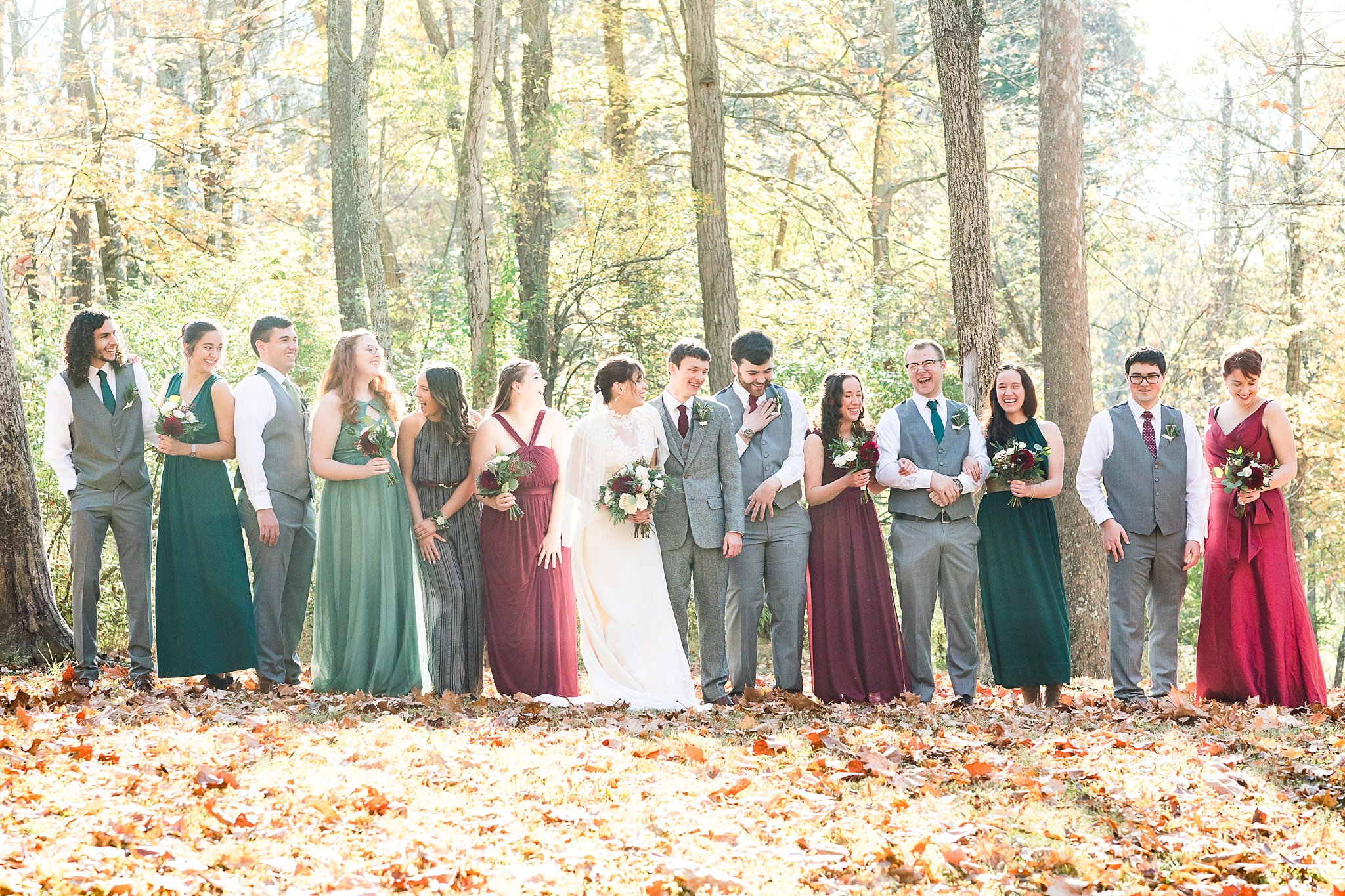 The day started so early, that it was still dark outside! I was thankful to be able to use the fireplace mantel to hang the dresses on. Aimee chose a unique and lovely vintage dress from Esty that was perfect for her! She was a gorgeous bride! For bridesmaids dresses, Aimee choose a beautiful array of burgundy and greens for that looked stunning together!