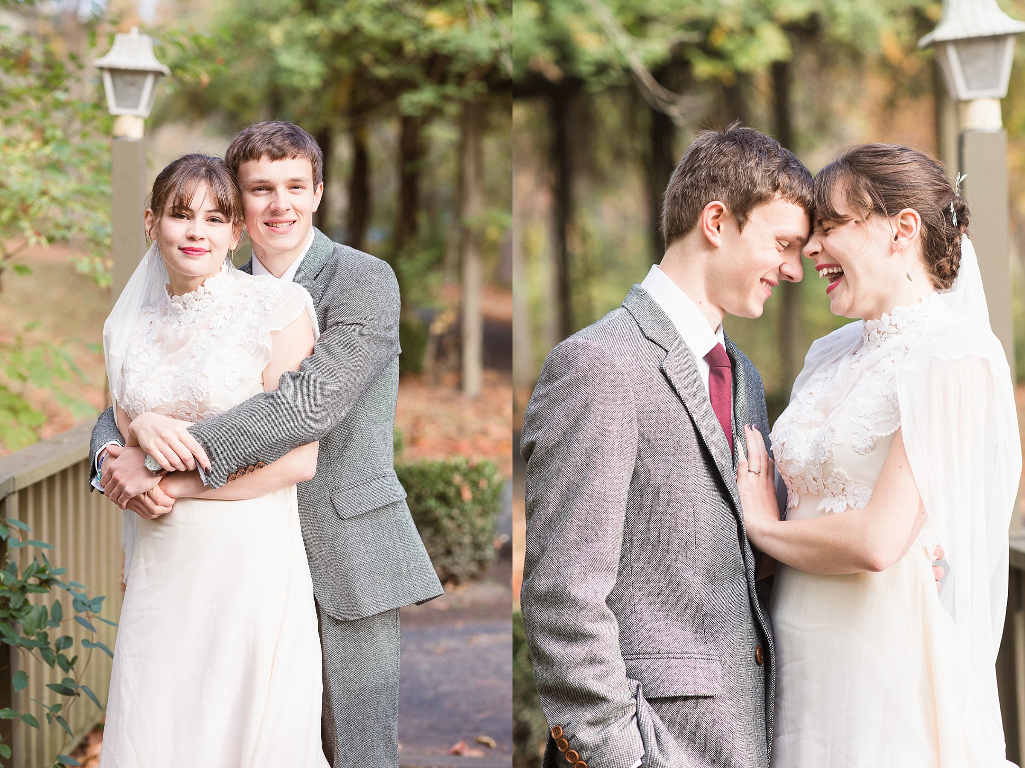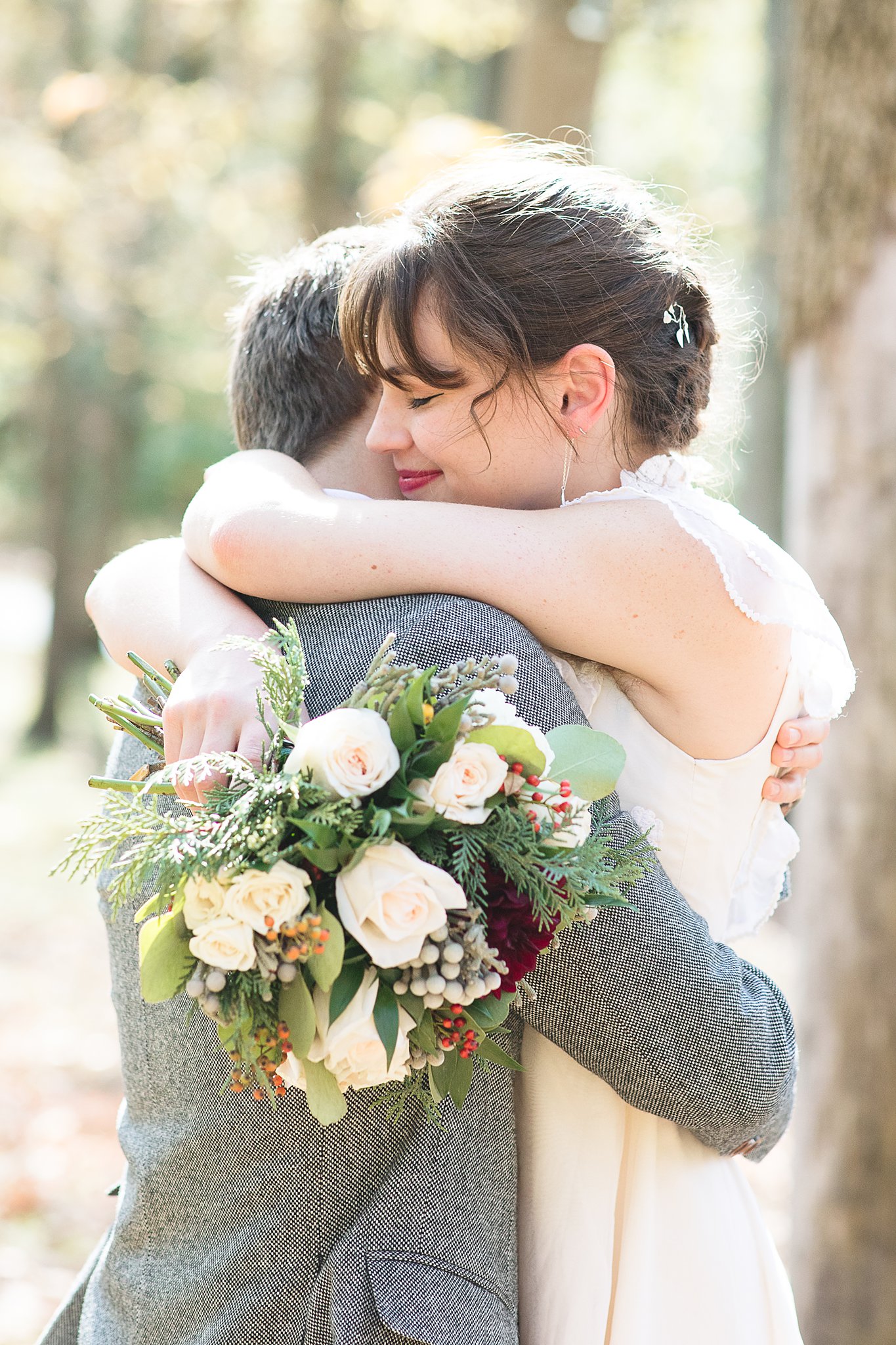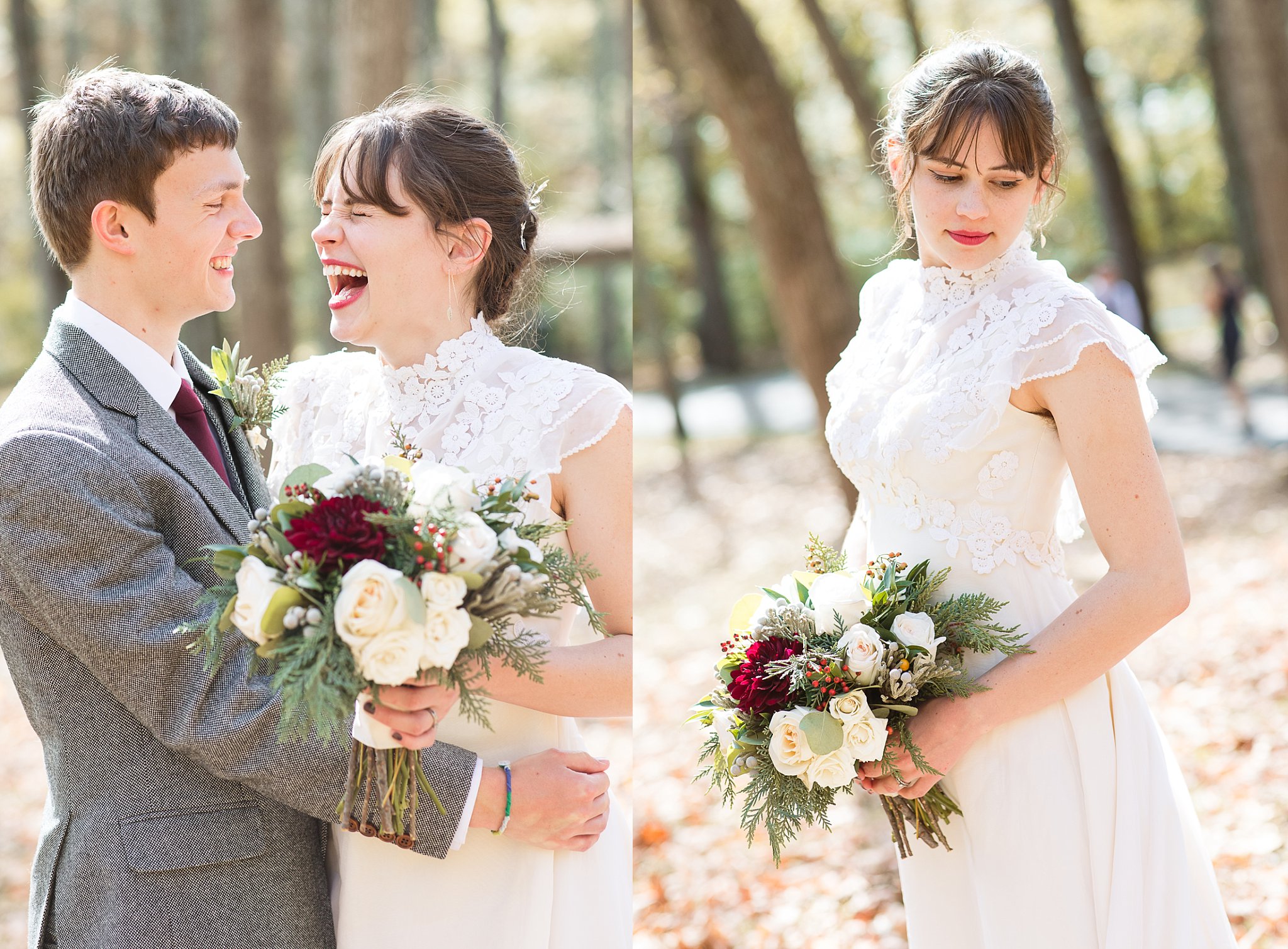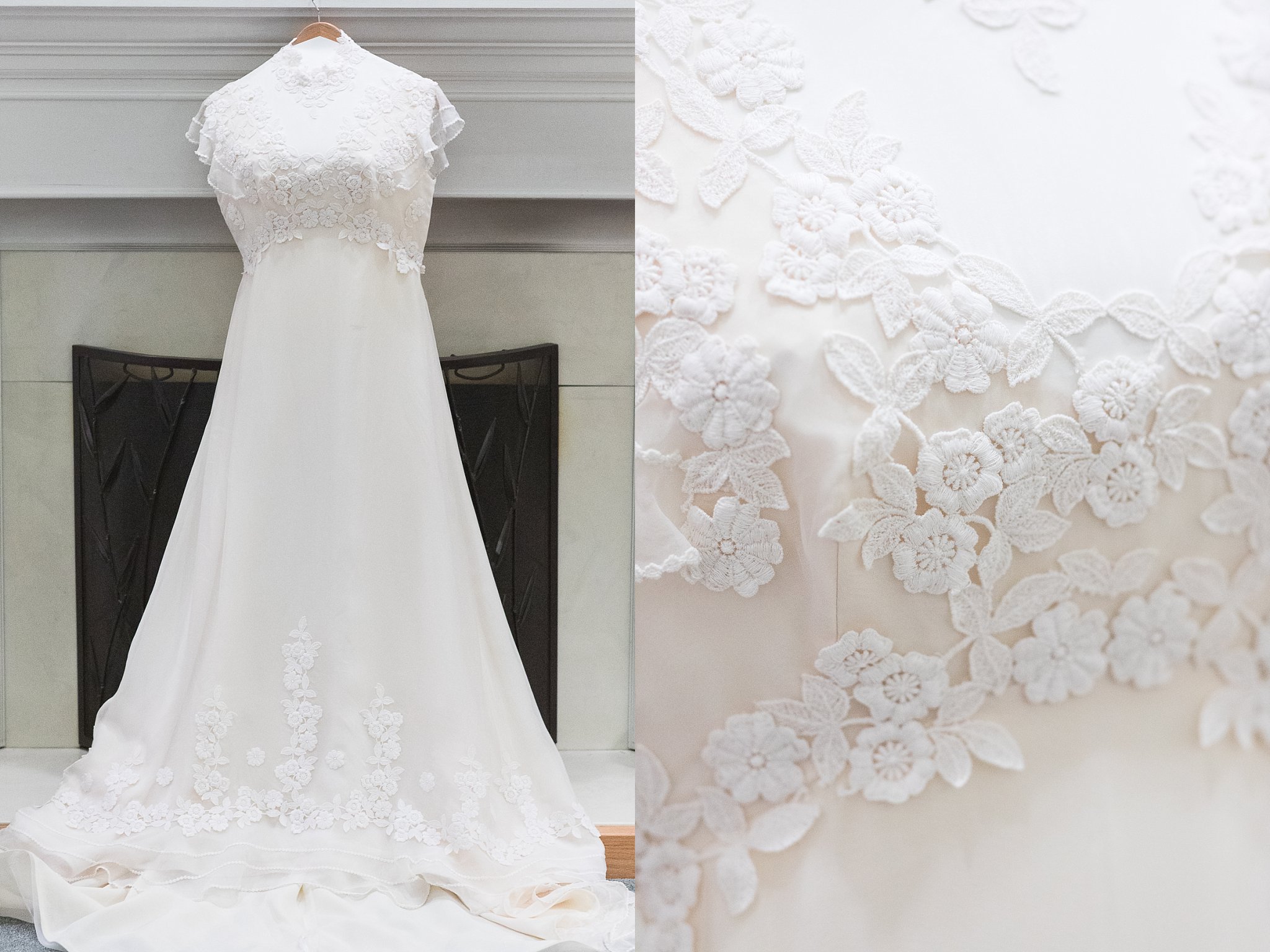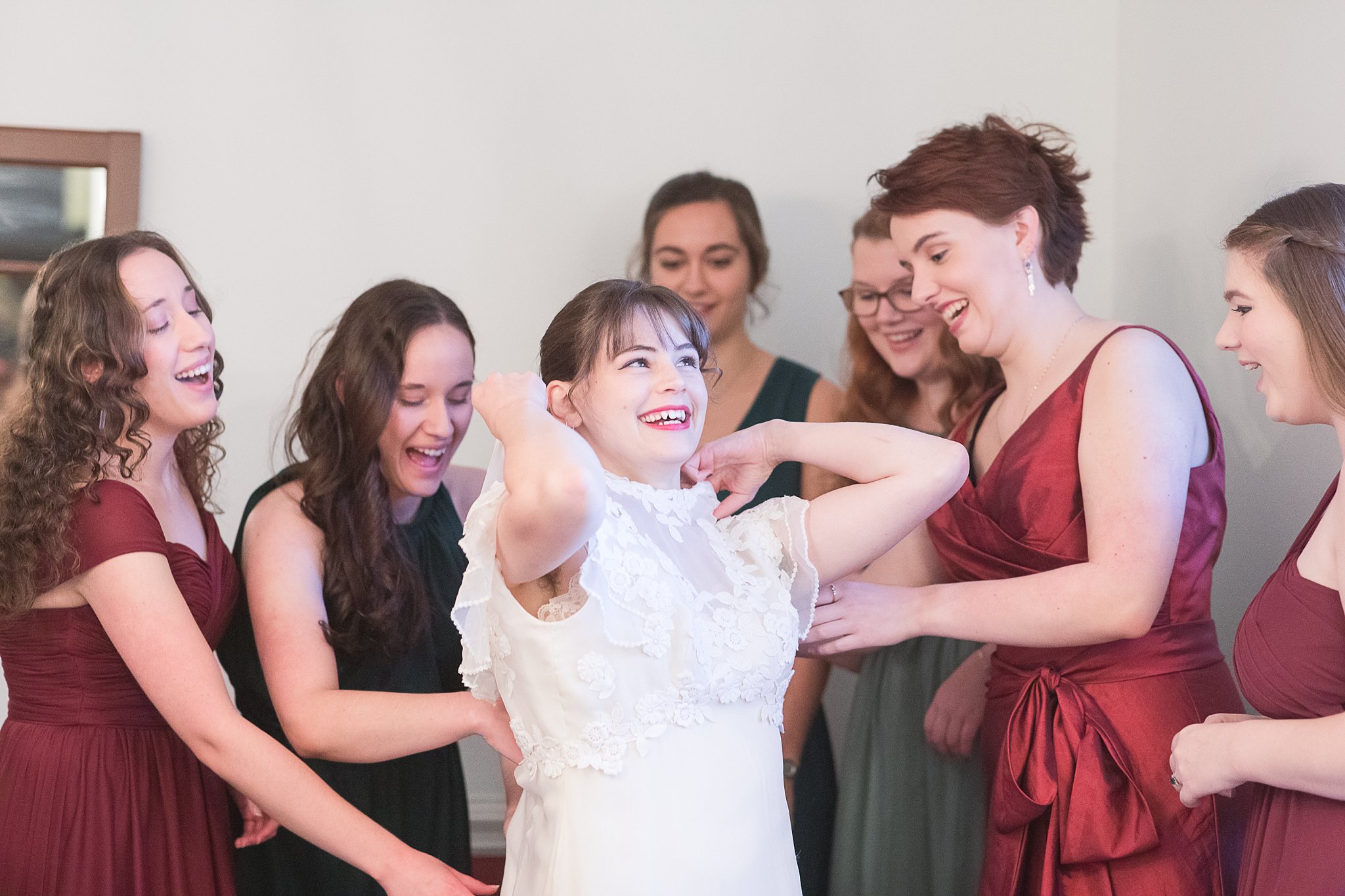 The day started so early, that it was still dark outside! I was thankful to be able to use the fireplace mantel to hang the dresses on. Aimee chose a unique and lovely vintage dress from Esty that was perfect for her! She was a gorgeous bride! For bridesmaids dresses, Aimee choose a beautiful array of burgundy and greens for that looked stunning together!