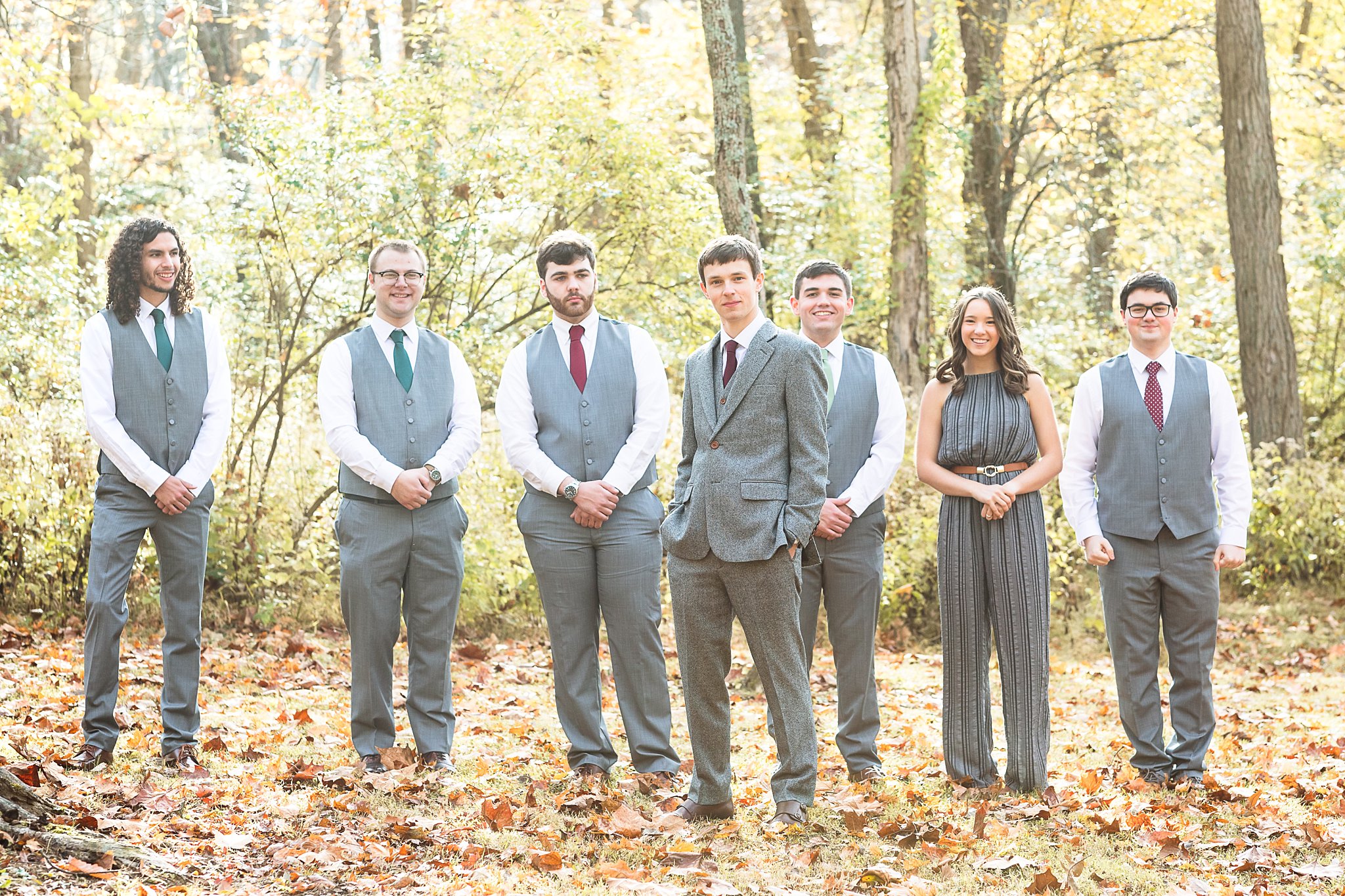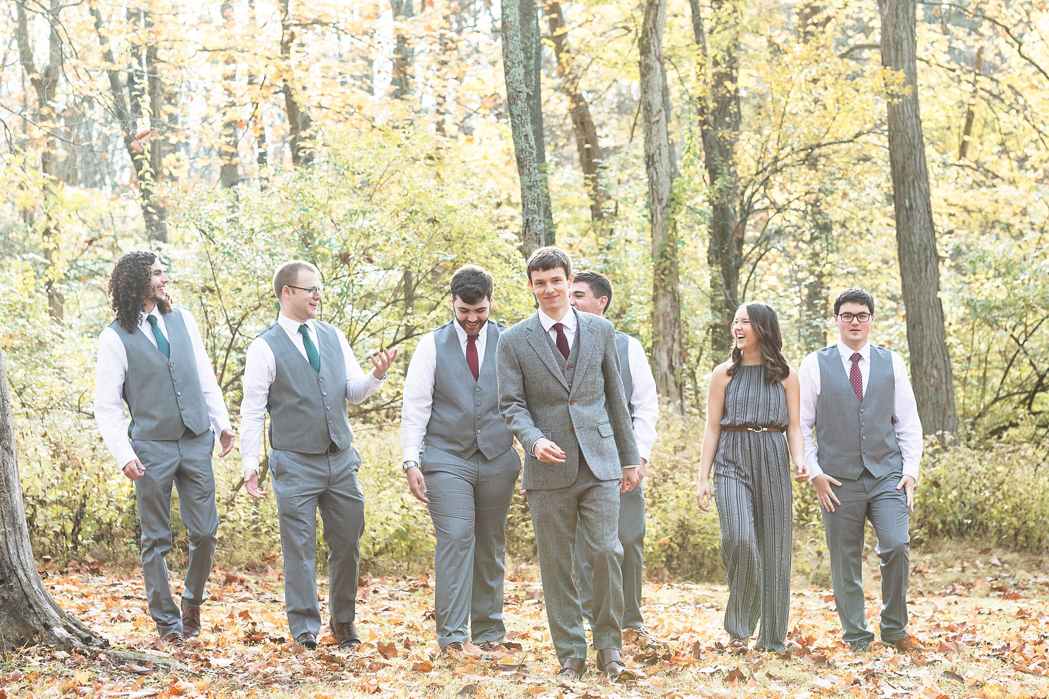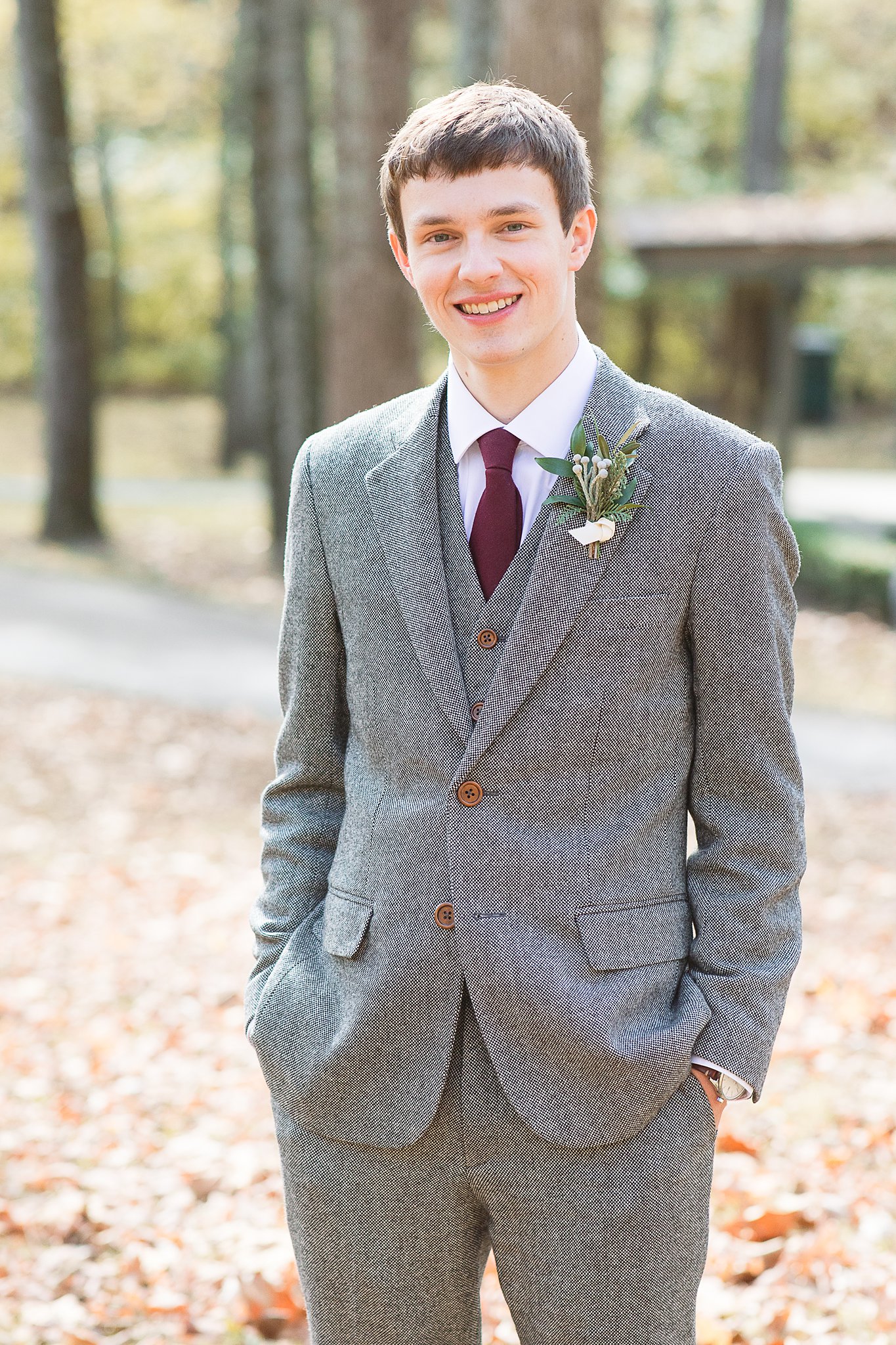 Noah choose a tweed suit with a burgundy tie. While the groomsmen mirrored his look with their own tweed-like attired.