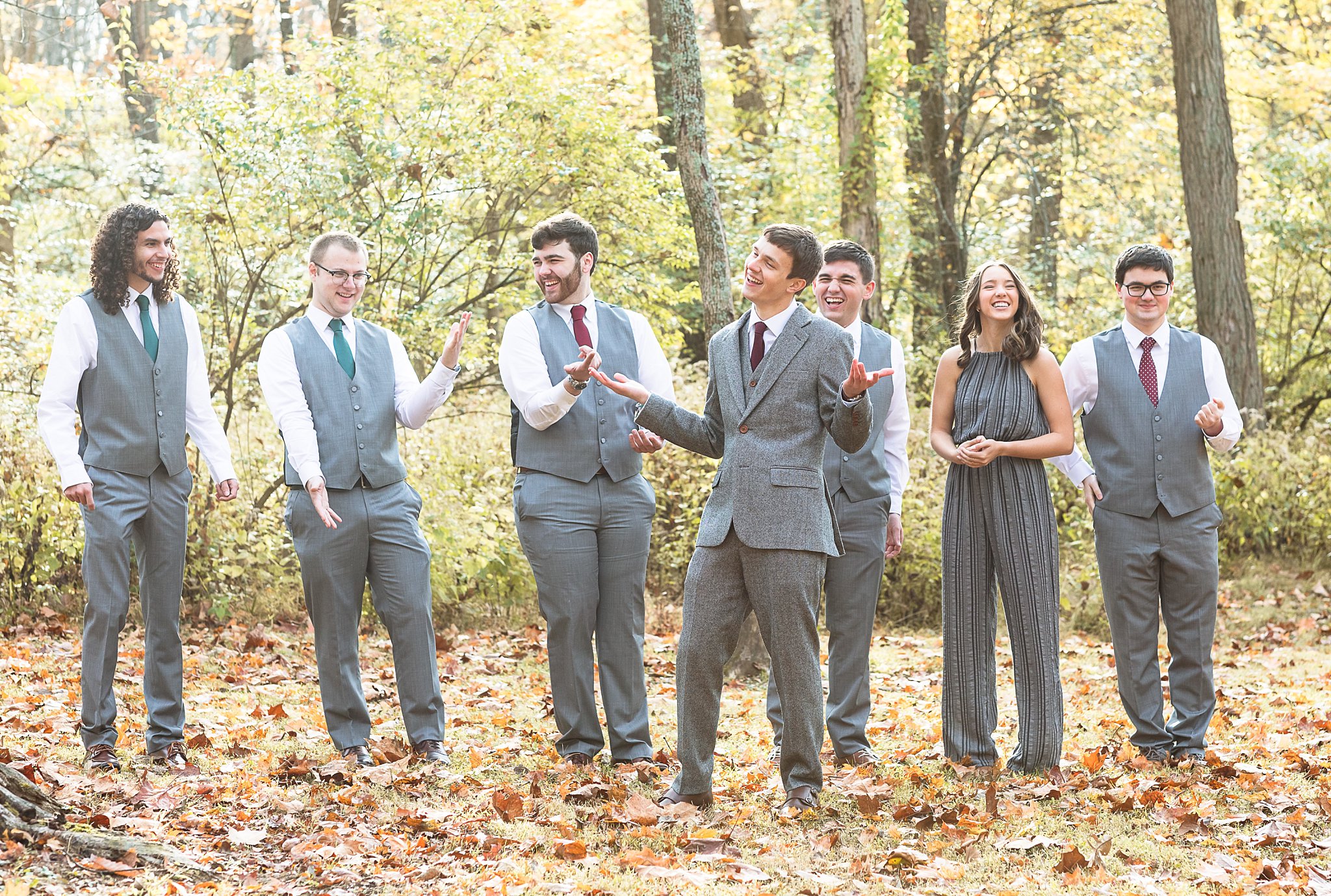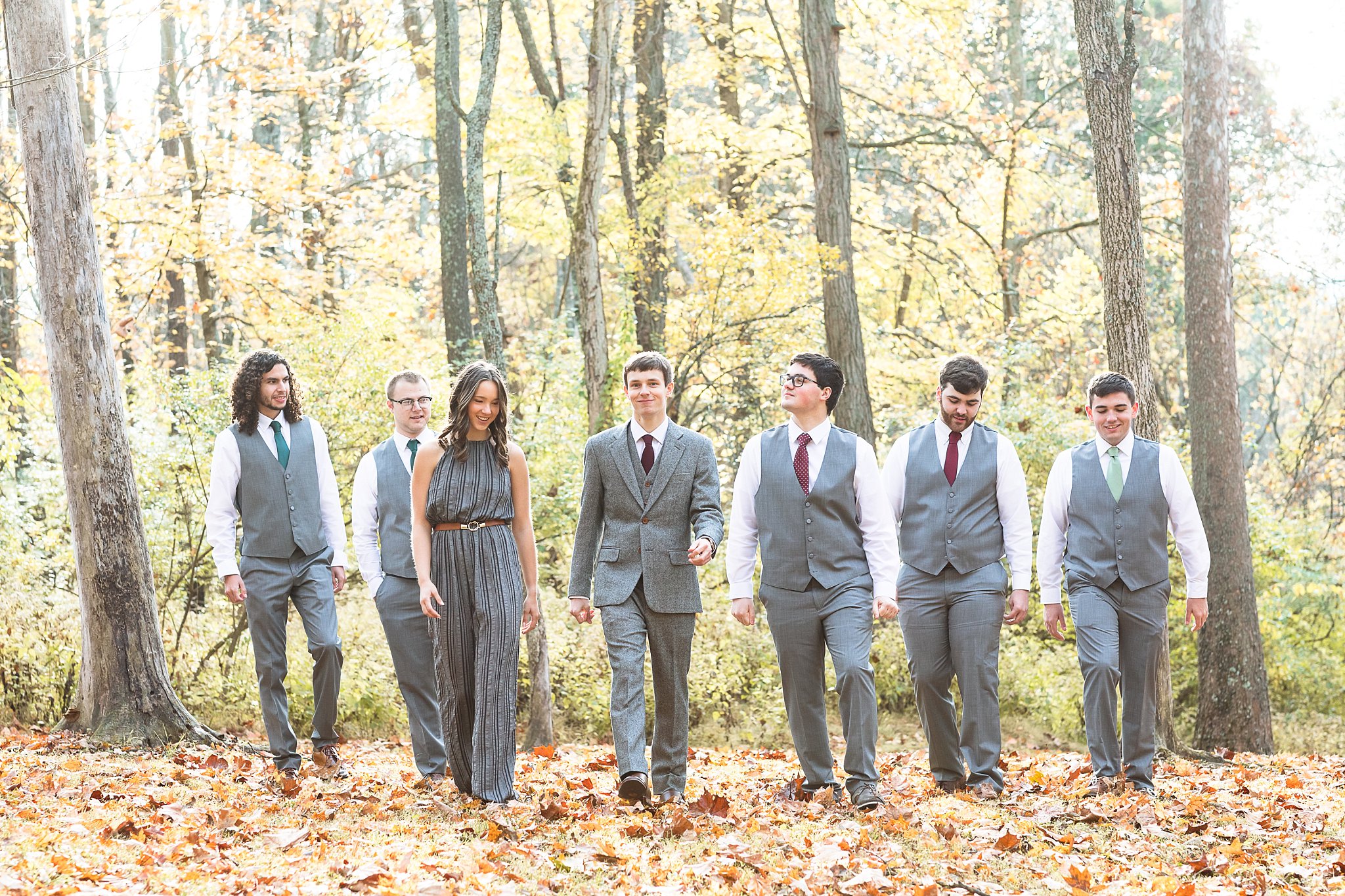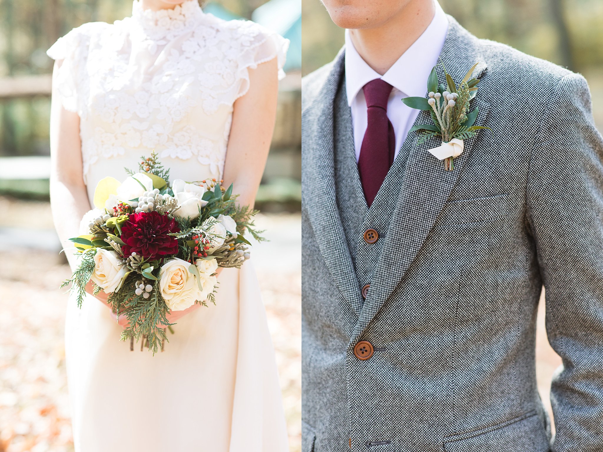Noah choose a tweed suit with a burgundy tie. While the groomsmen mirrored his look with their own tweed-like attired.