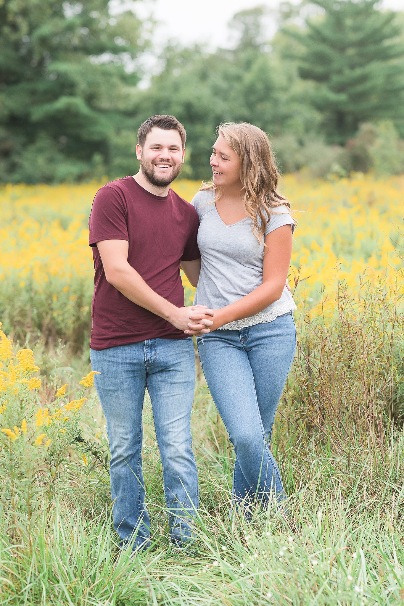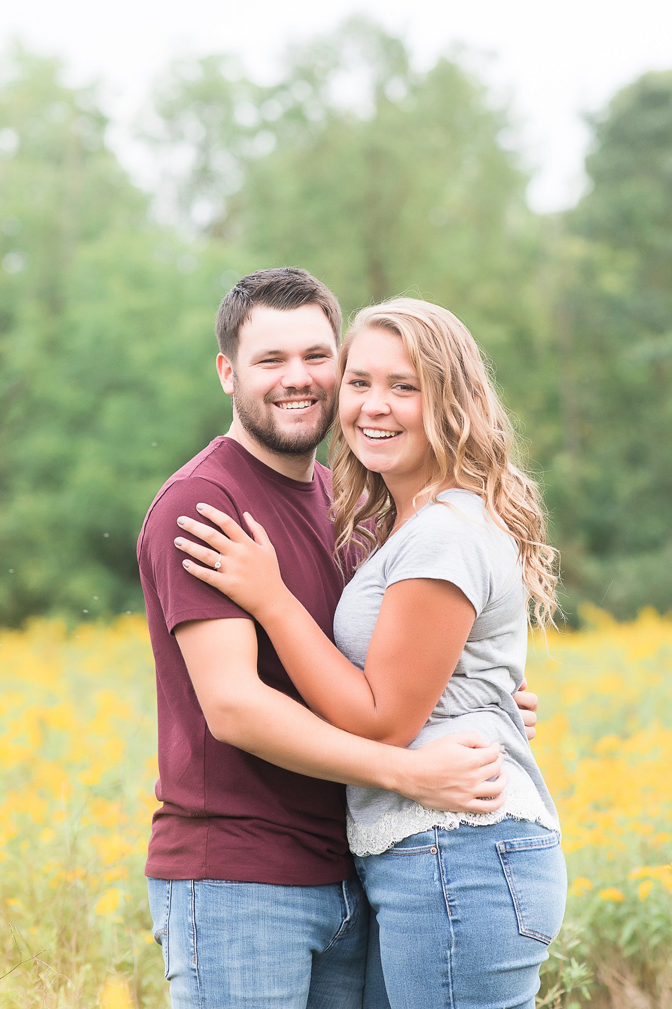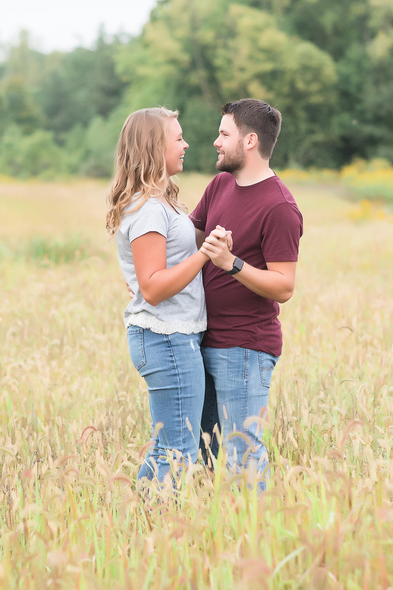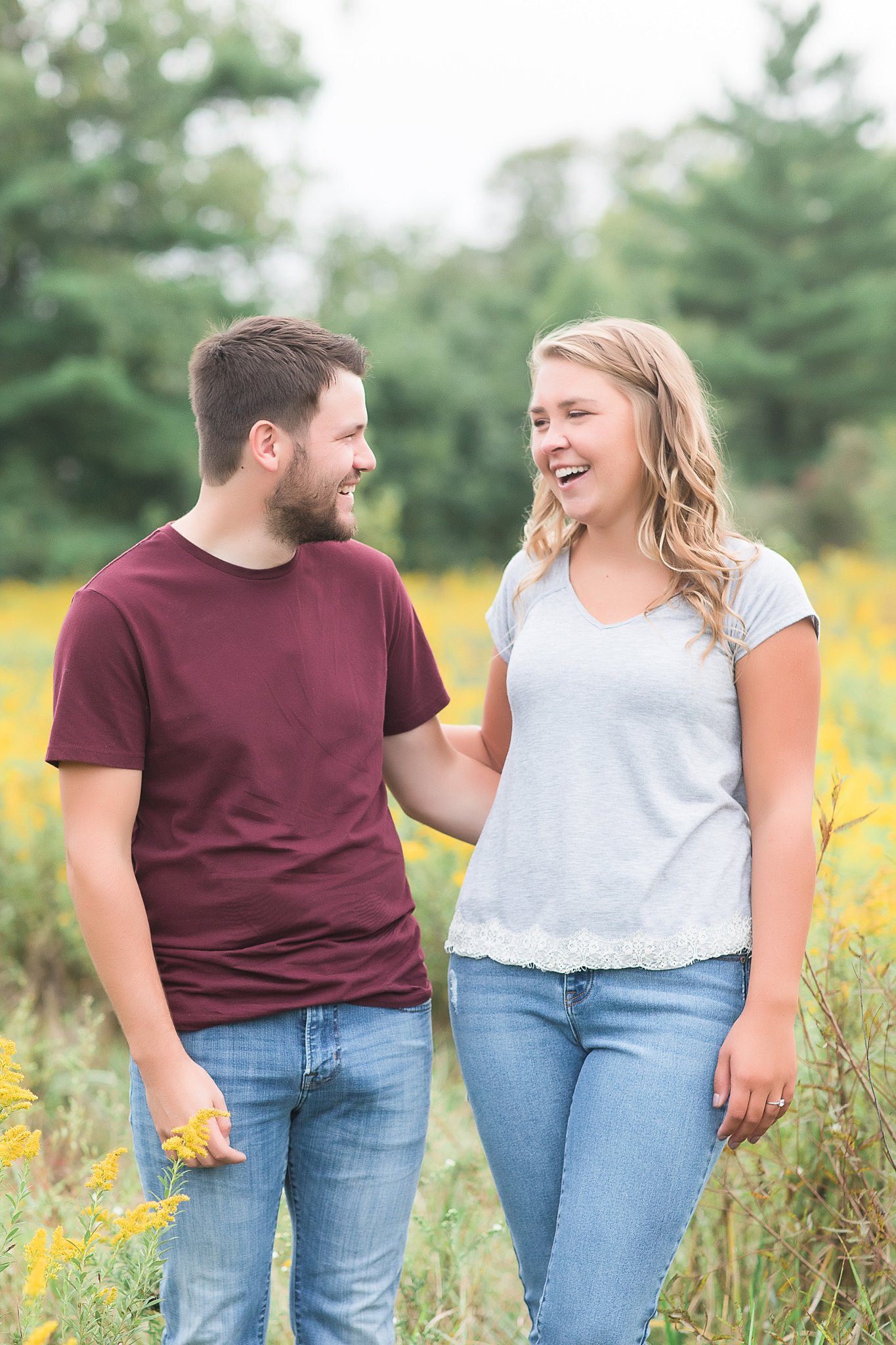 Due to COVID, although we’d be communicating since April, we didn’t actually meet until their engagement session at Salamonie Lake this September. They were even more wonderful in person! At Alyson’s suggestion we found a picnic table and began their engagement session sitting down to get to know each other a bit. I loved this! I found we were all a bit more at ease and relaxed by the time we started taking pictures. Alyson and Dustin put a lot of time and though into the location for their engagement session, wanting to be sure they chose a location that fit them well as a couple. Salamonie Lake, a location they were very familiar with was perfect! We enjoyed the variety of setting provided in one space–water, trees and fields of grasses and wildflowers.