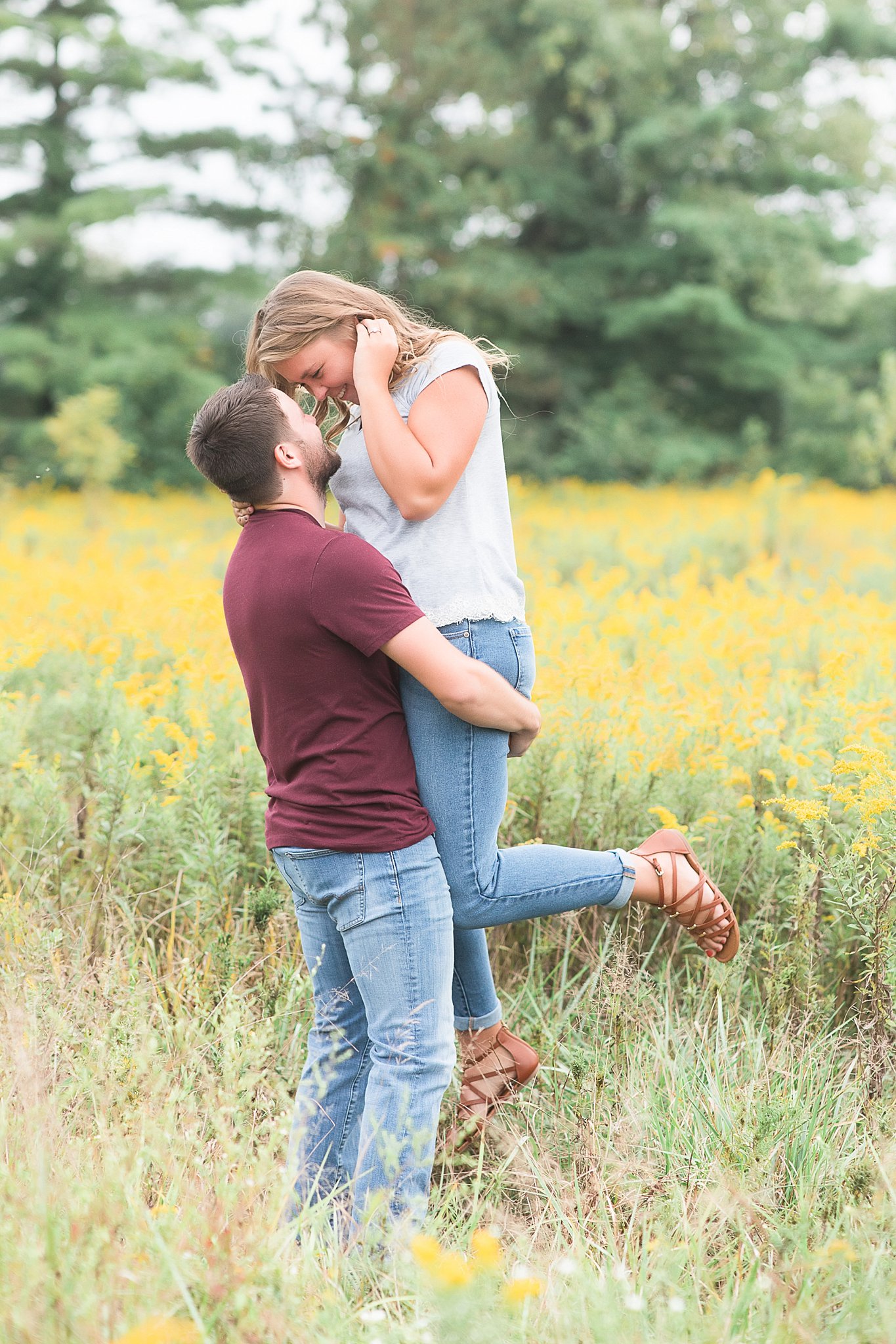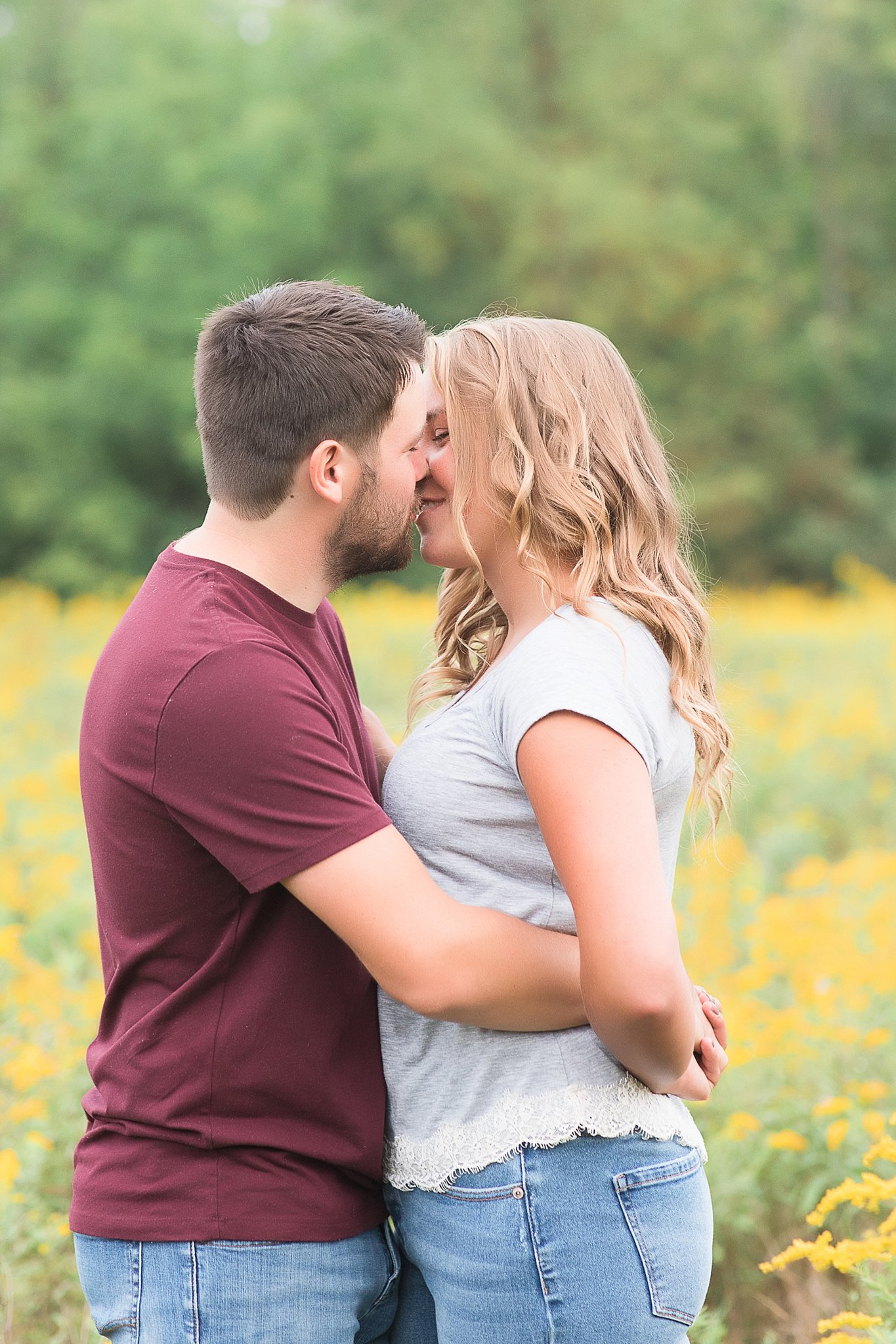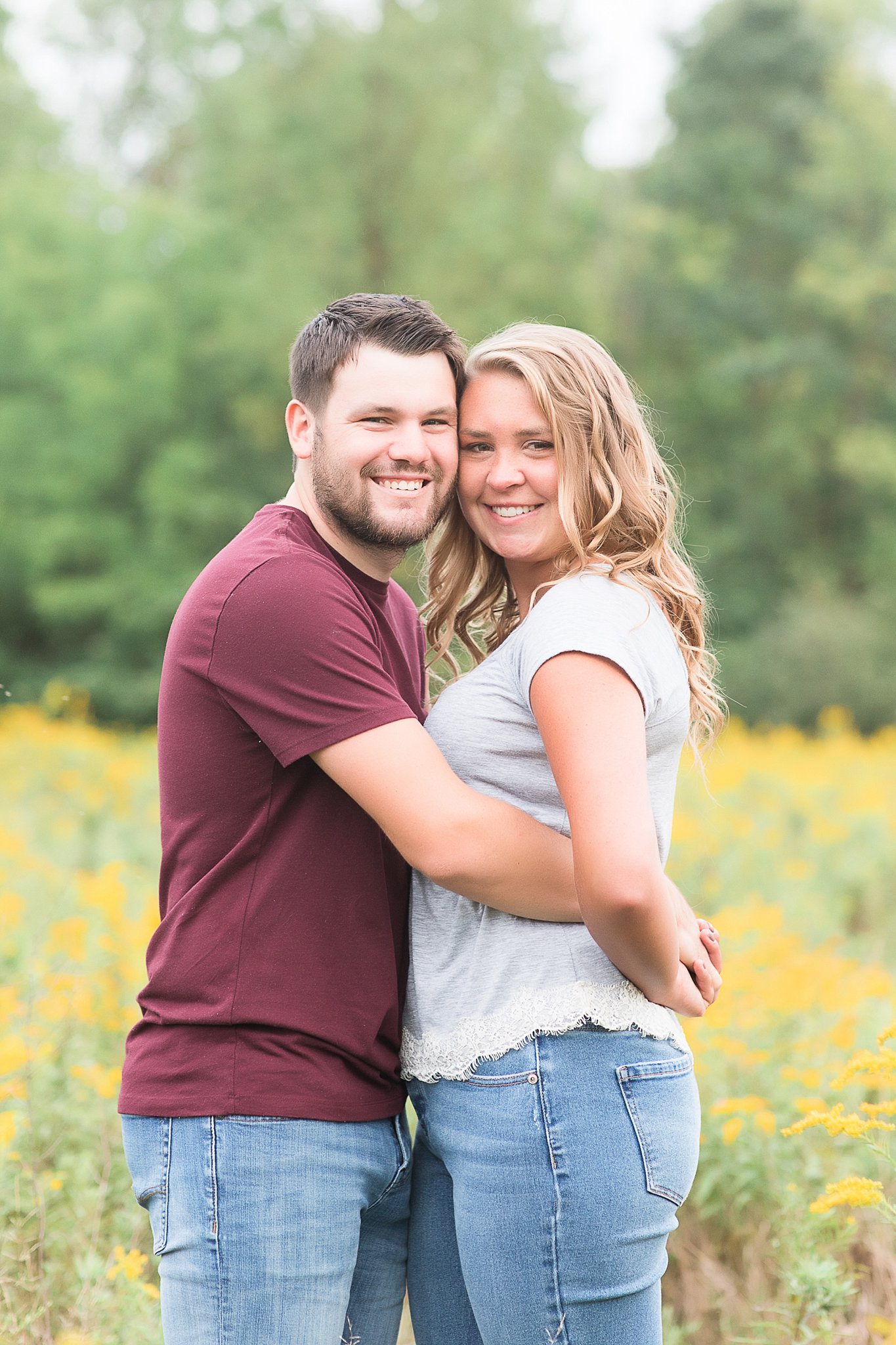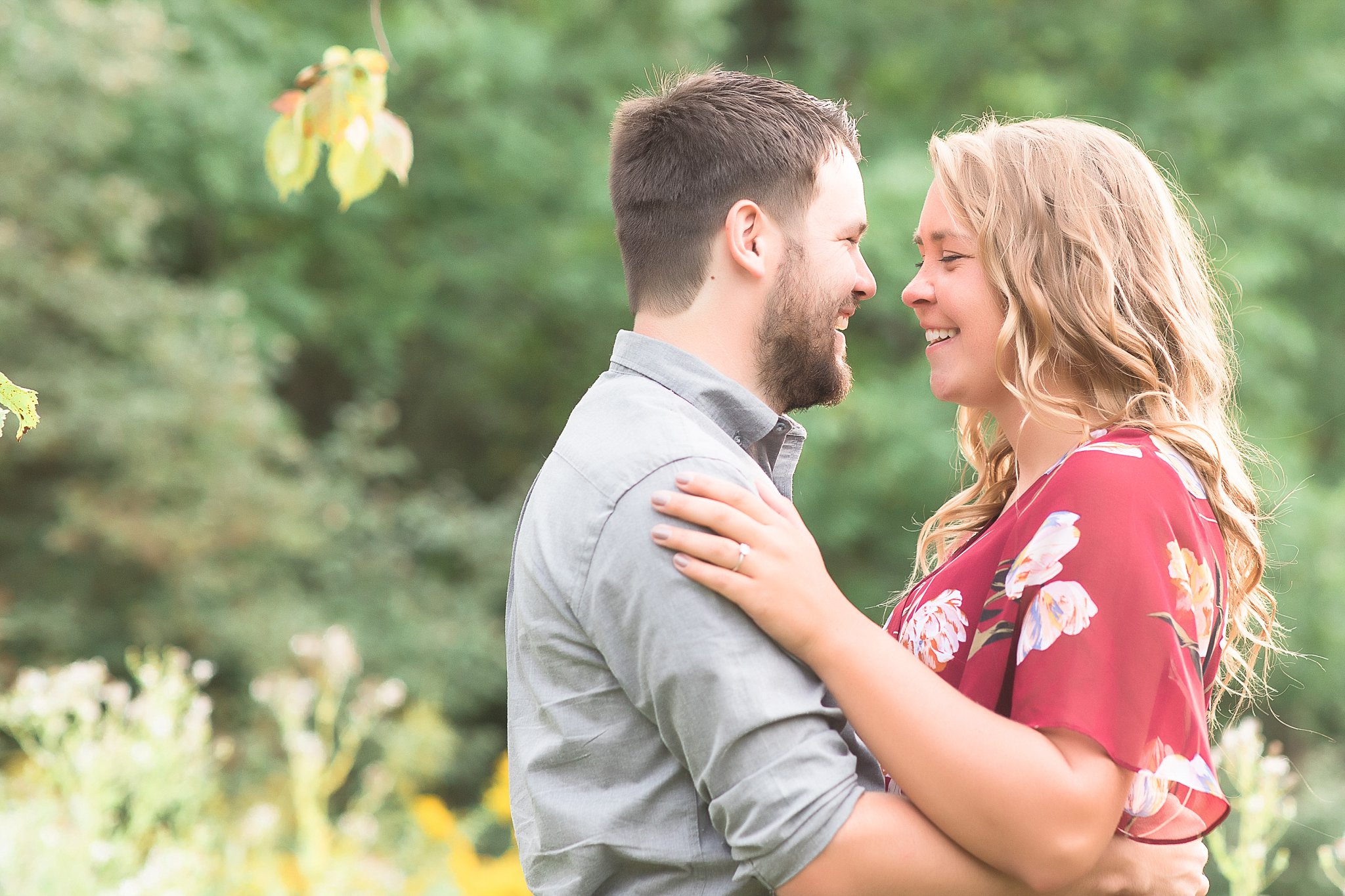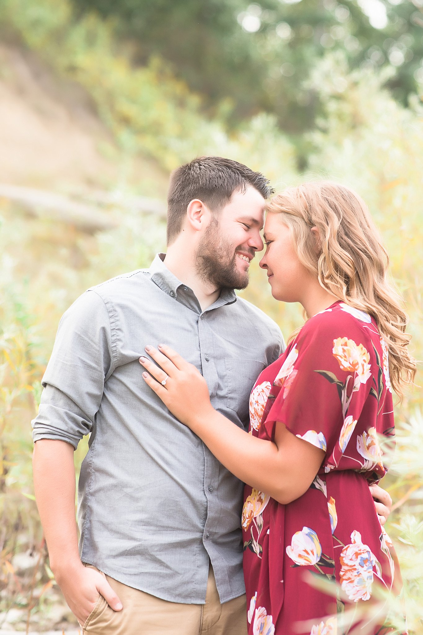 Due to COVID, although we’d be communicating since April, we didn’t actually meet until their engagement session at Salamonie Lake this September. They were even more wonderful in person! At Alyson’s suggestion we found a picnic table and began their engagement session sitting down to get to know each other a bit. I loved this! I found we were all a bit more at ease and relaxed by the time we started taking pictures. Alyson and Dustin put a lot of time and though into the location for their engagement session, wanting to be sure they chose a location that fit them well as a couple. Salamonie Lake, a location they were very familiar with was perfect! We enjoyed the variety of setting provided in one space–water, trees and fields of grasses and wildflowers.