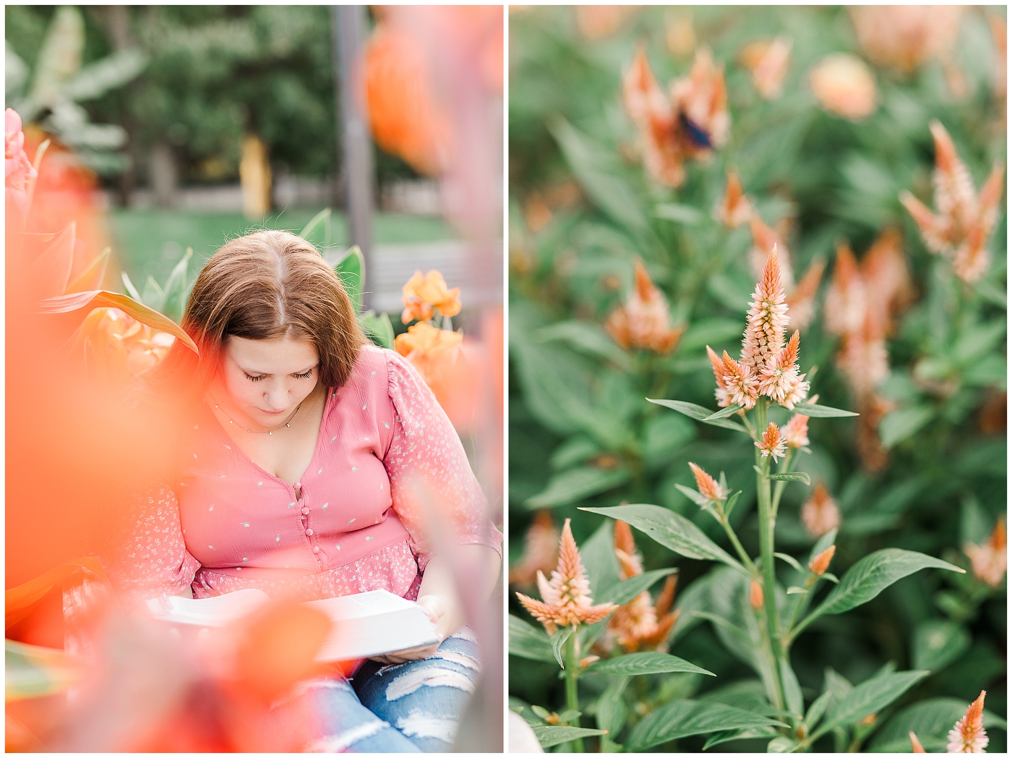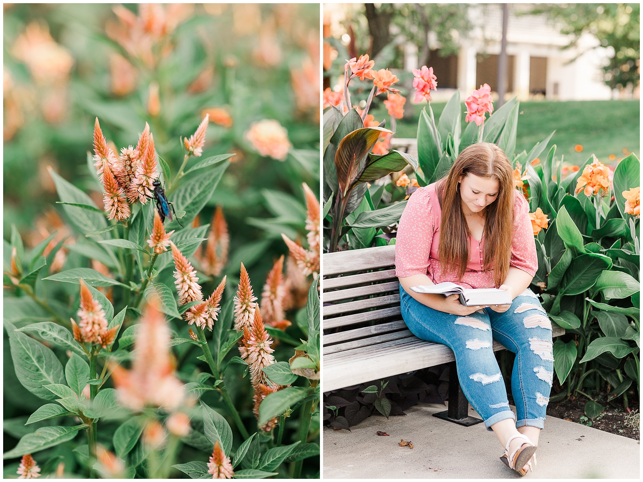 We were able to find a free parking lot to meet up in, then we set out.  Let’s go this way!  We pulled up Google maps, which was surprisingly not helpful!  We quickly found Headwaters Park.  Who doesn’t love their beautiful water fountain?  Alyssa rocked her session from the very begining!  We used the water fountain as a backdrop.  Then found flowers almost exactly the color of her shirt!  We also found a huge wasp (seriously it was probably 2 incheds long!) on the flowers.  We talked bugs and flowers and the wasp left us a lone.