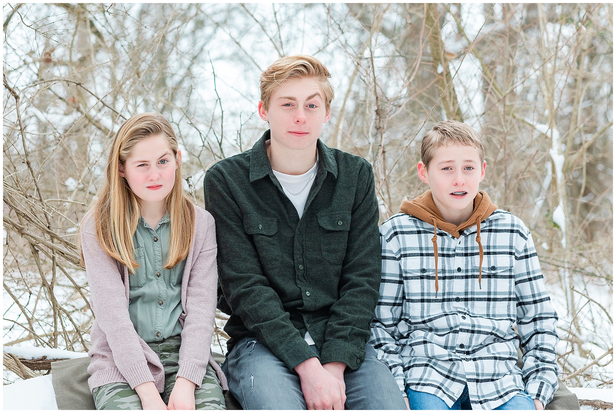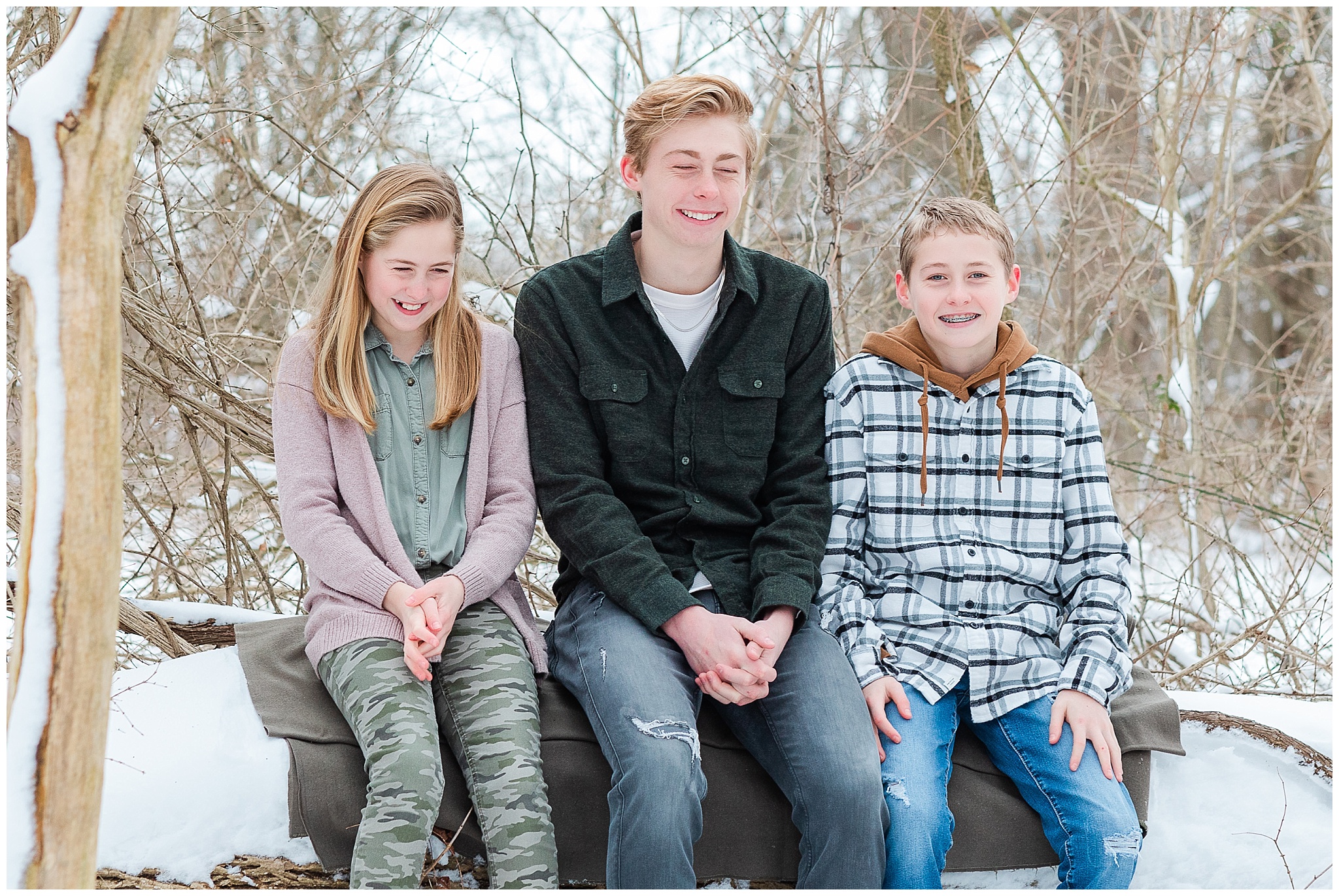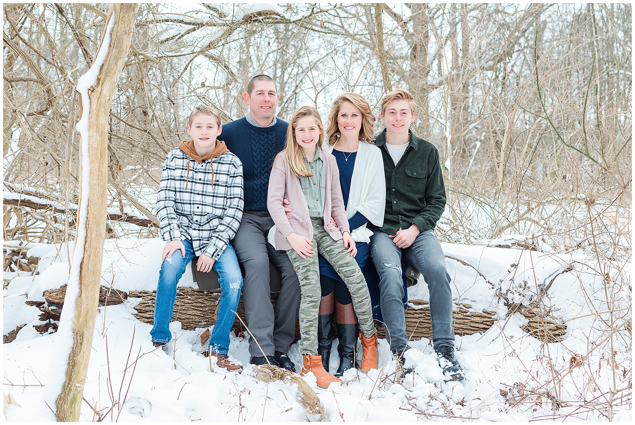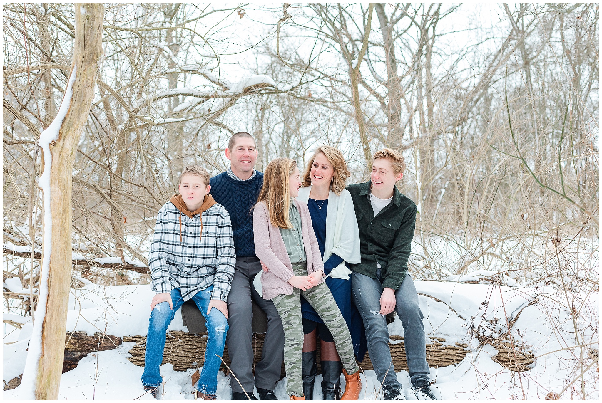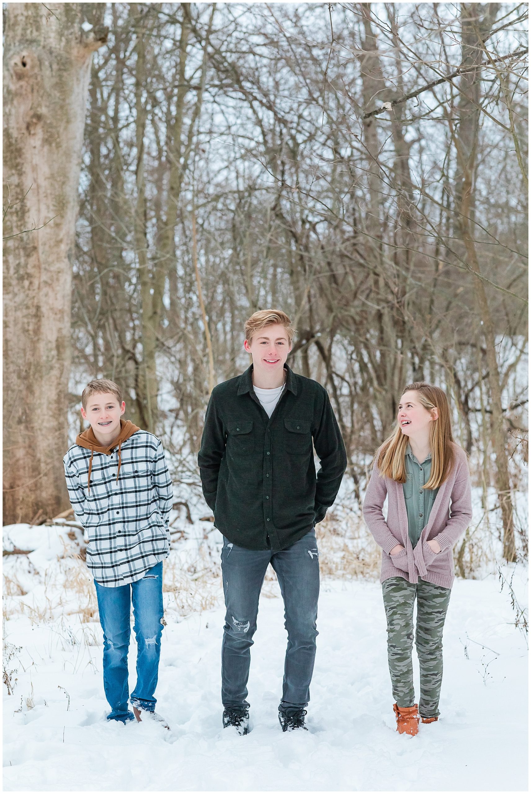A short hike through the snow and we were in a beautiful wooded location. It was cold! So we worked quickly to capture a variety of images, putting coats back on in between. Traci, Shane and kids were fabulous! They were so fun and easy to work with and never complained about the cold! I tried hard to distract them from the cold and make them smile with lame jokes. My jokes are embarrassingly lame! I think I need a joke book!