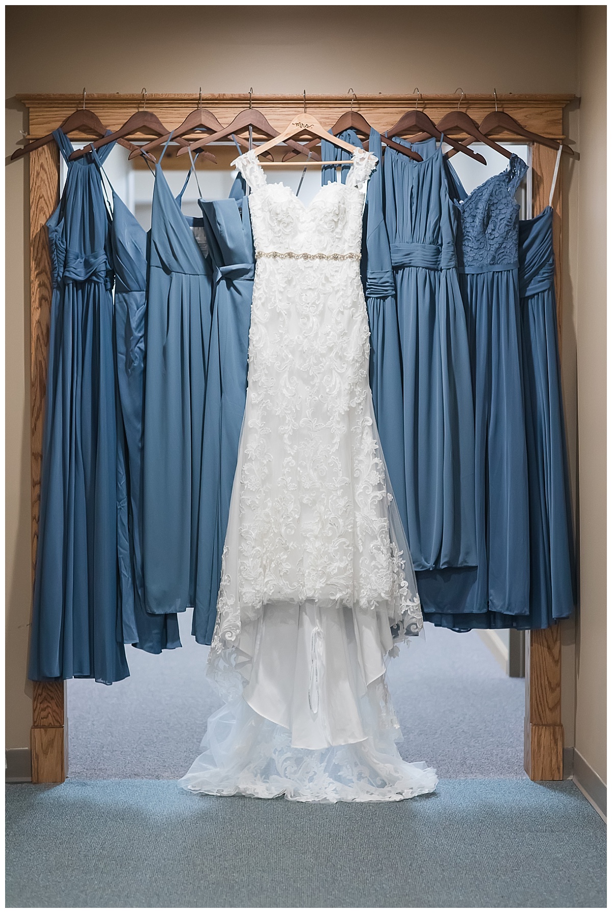 If you have special  hangers for your wedding dress and  bridesmaids transfer the dresses to those hangers.  This is an easy thing for the bridesmaids to do while they are waiting for their turn at hair and make-up.  It is such a huge time saver for me and I appreciate it so much!  All the dresses on decorative hangers displayed together makes such a beautiful picture!  I purchased a set just to be able to offer them for use to my brides.